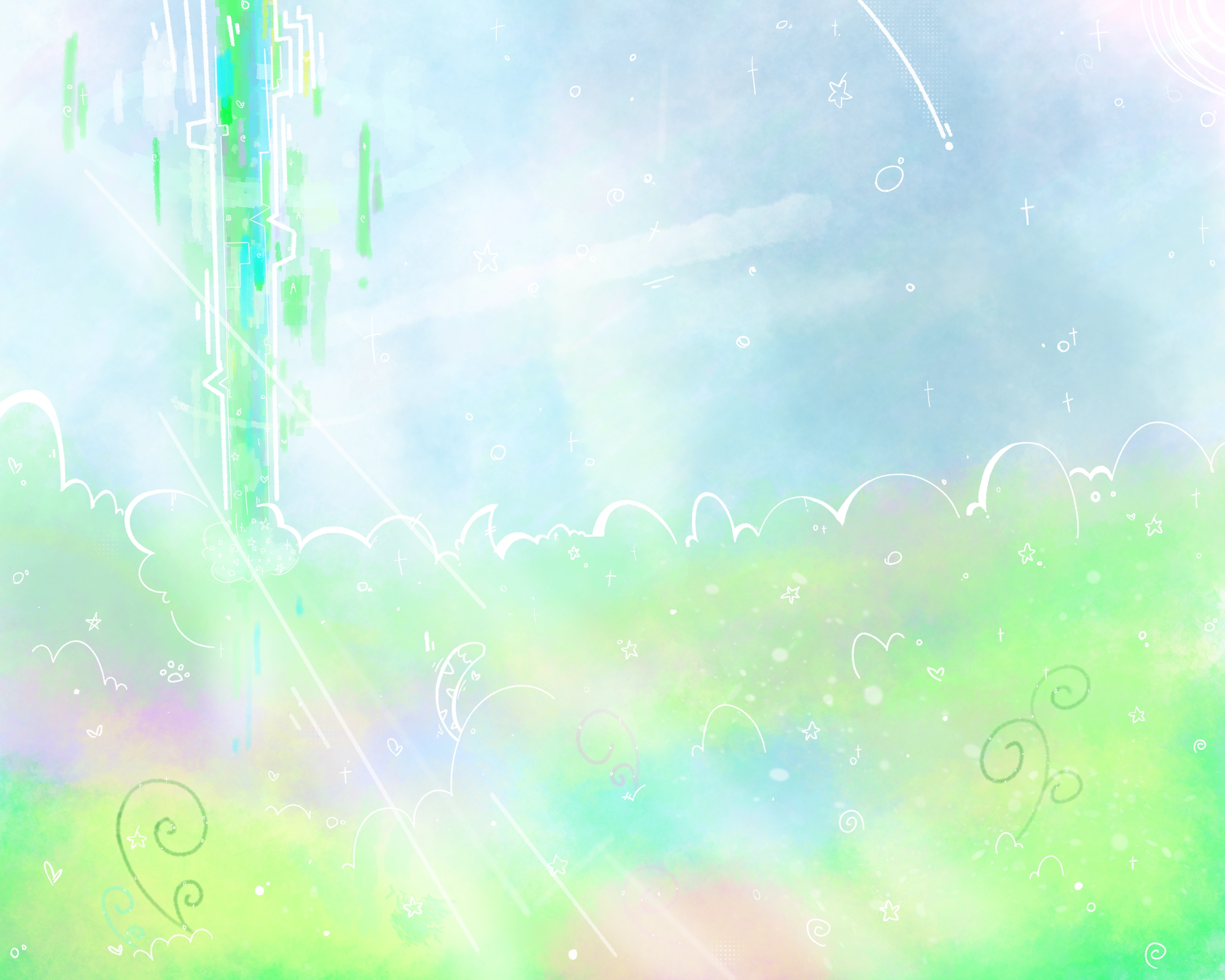 A picture of an abstract, cloudly place of starlight and soft colors and sunlight. There is a large bright beam of light in the sky further within this realm, and a soft warm blue cloudy sky.