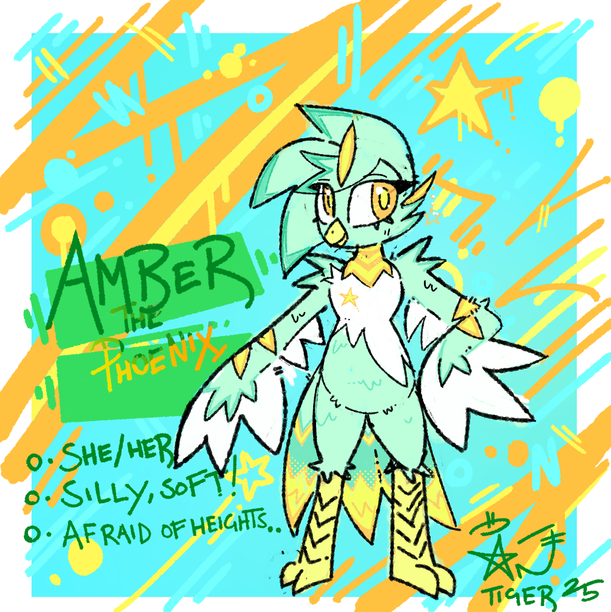 There is a colorful abstract background, and text that says "Amber The Phoenix!","She/Her","Silly, Soft!","Afraid Of Heights..."