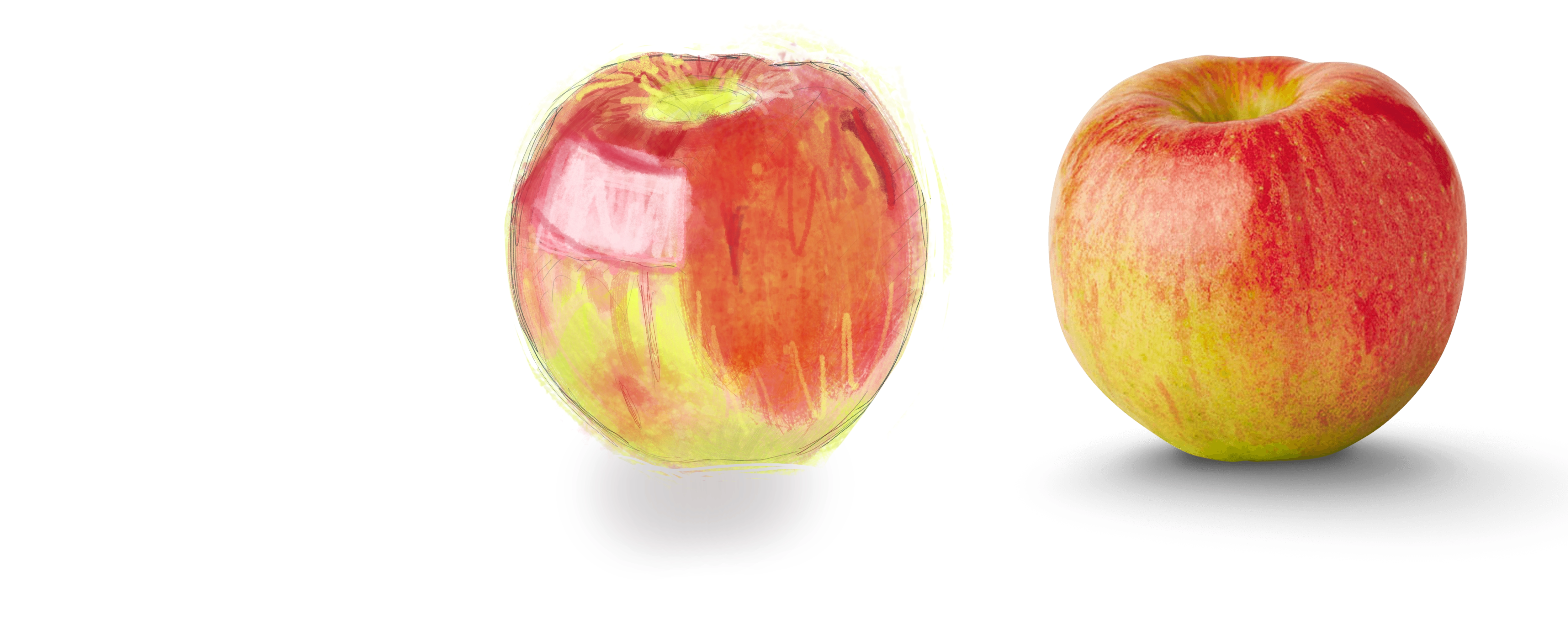 A rendered sketch of an apple, next to the real life picture of the reference apple.