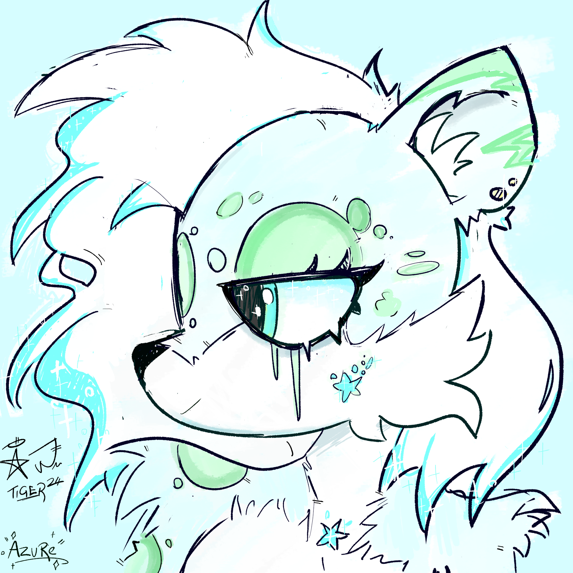 A picture of Azure the Snowleopard from the chest up. She has a neutral expression, with low-lidded blue eyes that have bags under them, as well as markings that look both like icicles and tear tracks. She has muted-blue fur, with a pure white muzzle and cheek floofs, as well as a pure white fluffy mane that sparkles blue at the edges. She has green spots, and green tiger stripes on her ears.