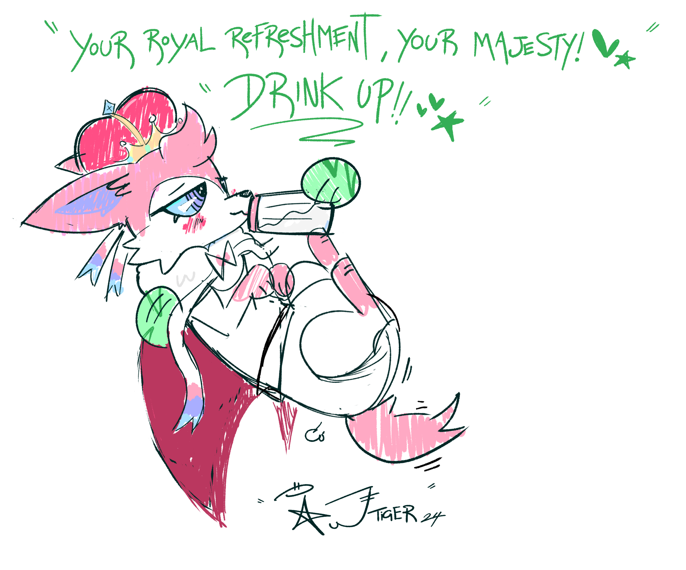 Dialogue from Tiger reads: Your Royal Refreshment, Your Majesty! Drink up!!