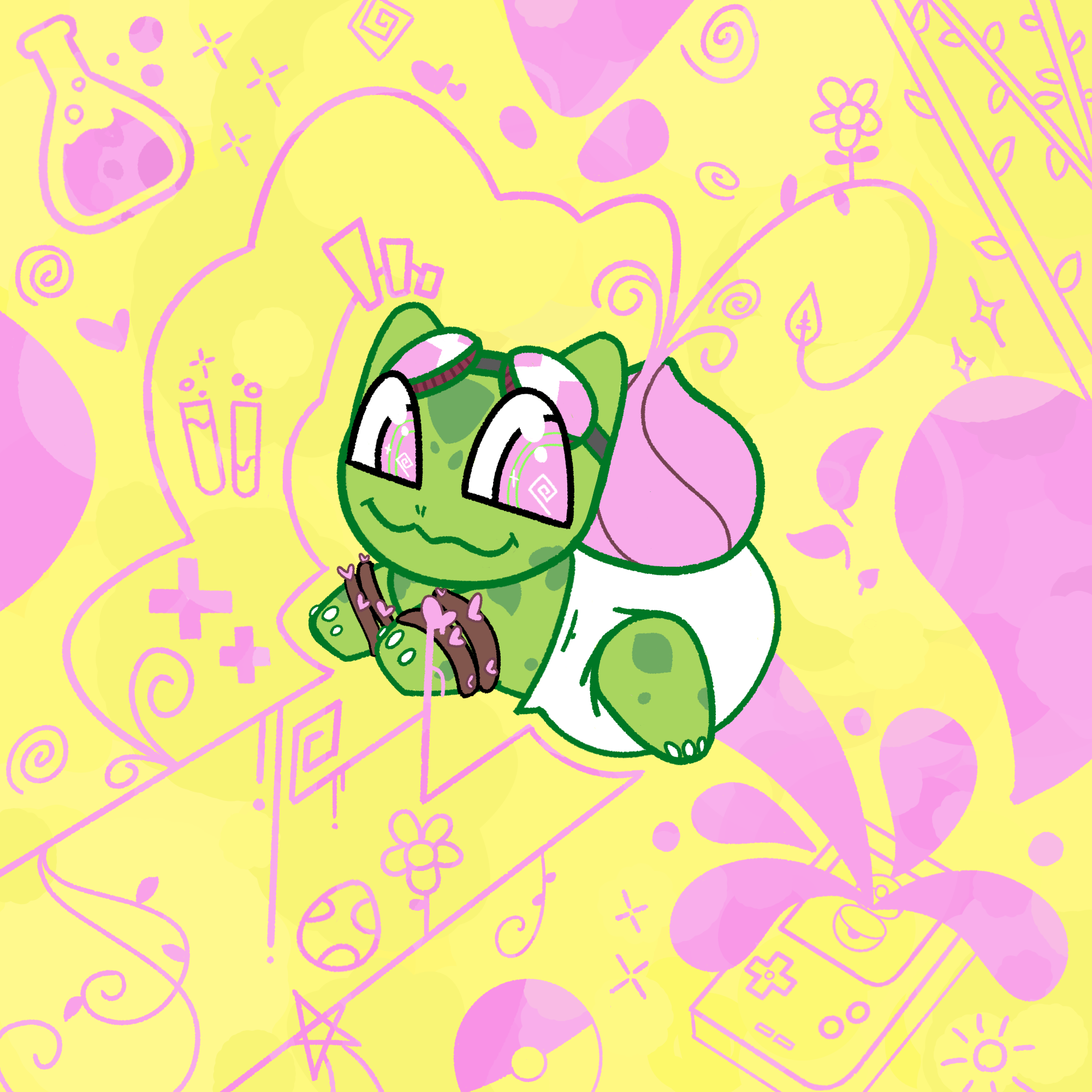 A picture of a Bulbasaur with pink-lensed goggles, wearing a plain white diaper. Pink lines drip from the brambles around his wrists and bloom out of the bulb on his back, and intersect around him to form shapes such as test tubes, poke-balls, vines, flowers and other associated imagery. There is a gameboy beneath him that it looks like he is leaping out of with an open poke-ball on the screen.