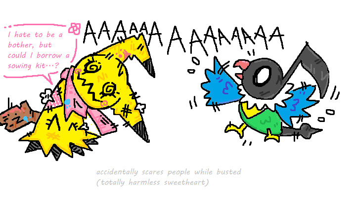 An MS-Paint picture of a Mimikyu named Mimzy and a surprised Chatot. Mimzy has a pink scarf, as well as a pink plaid patch on her costume, with a smiling blushing true face. She is waving with a shadowy limb. Her scarf, costume and wooden tail are lightly splattered with paint. She is lightly busted with stuffing at her seams and battered marks on her costume, with her fake head lopped. Chatot is flapping, with a shocked expression and a wide open beak
