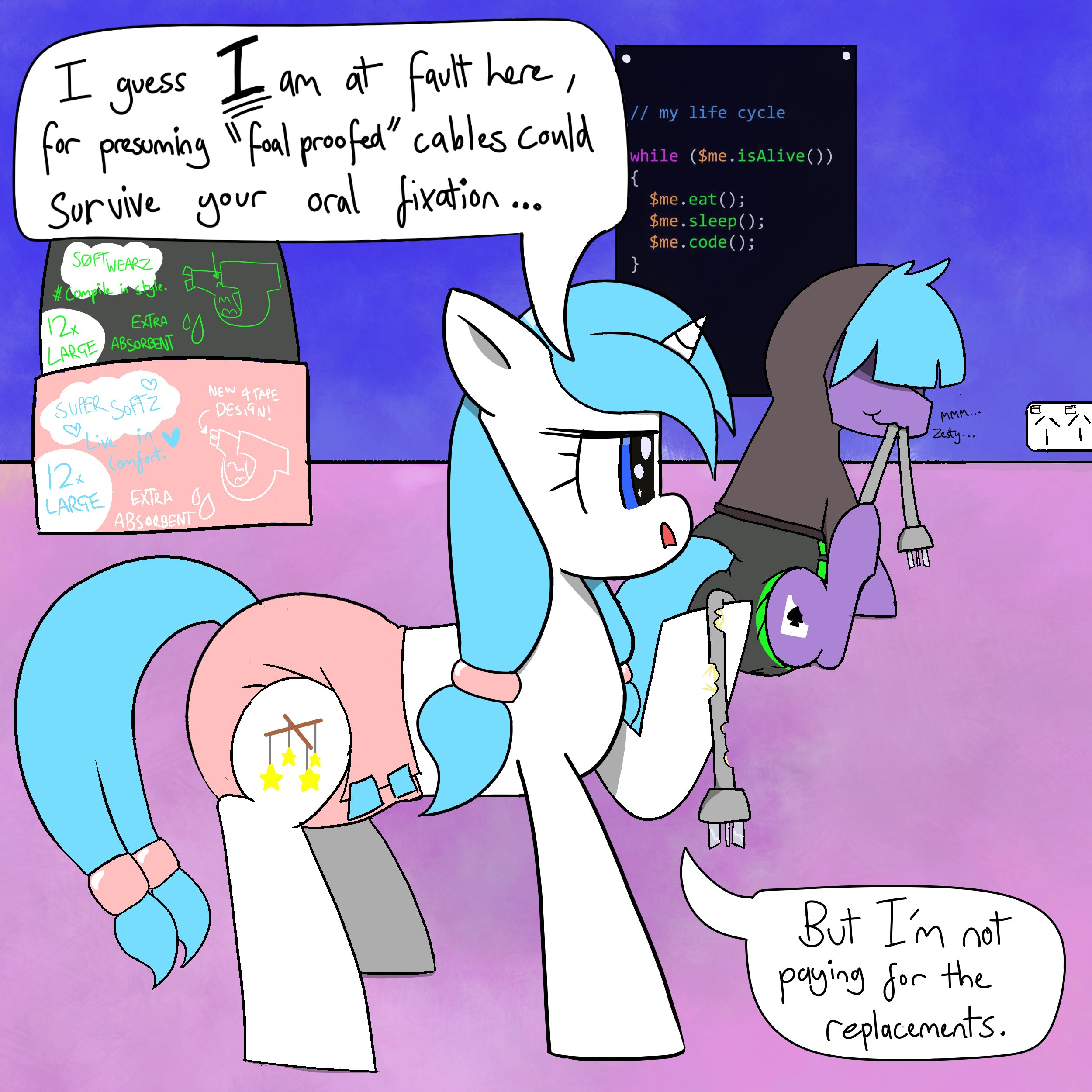 Dialogue from the mare reads: I guess I am at fault here, for presuming "foal proofed" cables could survive your oral fixation... But I'm not paying for the replacements.