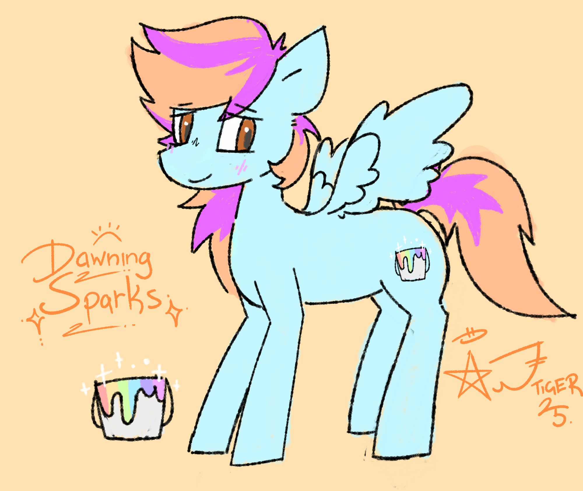 A picture of a light blue pegasus stallion with a long orange-and-purple mane and a short tail. He has brown eyes and has a shy, blushing expression with a smile, as well as a cutie mark of a paint bucket with rainbow paint.
