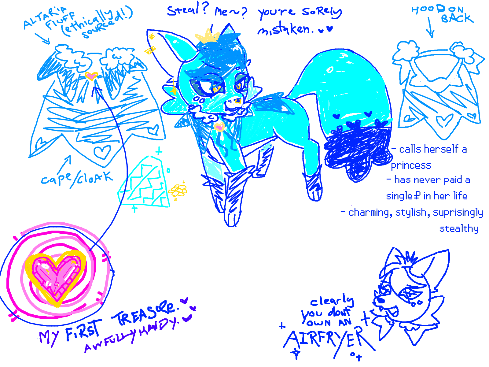 A reference sheet of Diamond the Nickit. She is a light blue Nickit with dark blue markins on her tail and paw socks and "mask", as well as deep blue hair with a crown on top of it. She wears a blue cape-cloak with altaria fluff around the neck, which is ethically sourced. She says: Steal? me~? you're sorely mistaken.