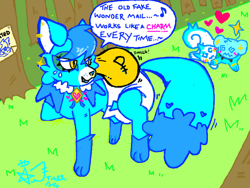 An MS-Paint picture of Diamond, the blue Nickit. She has a sack of Poke-dollars slung over her shoulder, and is wearing a plain white diaper, as well as her fur-lined coat. The charm at the center of the coat is emenating hearts. Behind her, a pair of Pokemon - a Pachirisu and a Shinx - lay fainted with blushing eyes and hearts above their heads, Attracted and defeated. She is standing in a forest's path, where a wanted poster for her can just be seen, nailed onto one of the trees.