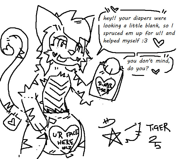 An MS-Paint picture of Rosa the Rat, turned into a plushie tiger, wearing a diaper aand holding up a diaper. They have a smug expression, patting their diaper with one paw while holding up another diaper. The diaper in their paw has a heart and "DIAPER TIGER" written on it. The tiger they are wearing has a heart and "UR FACE HERE LOLZ" written on it.