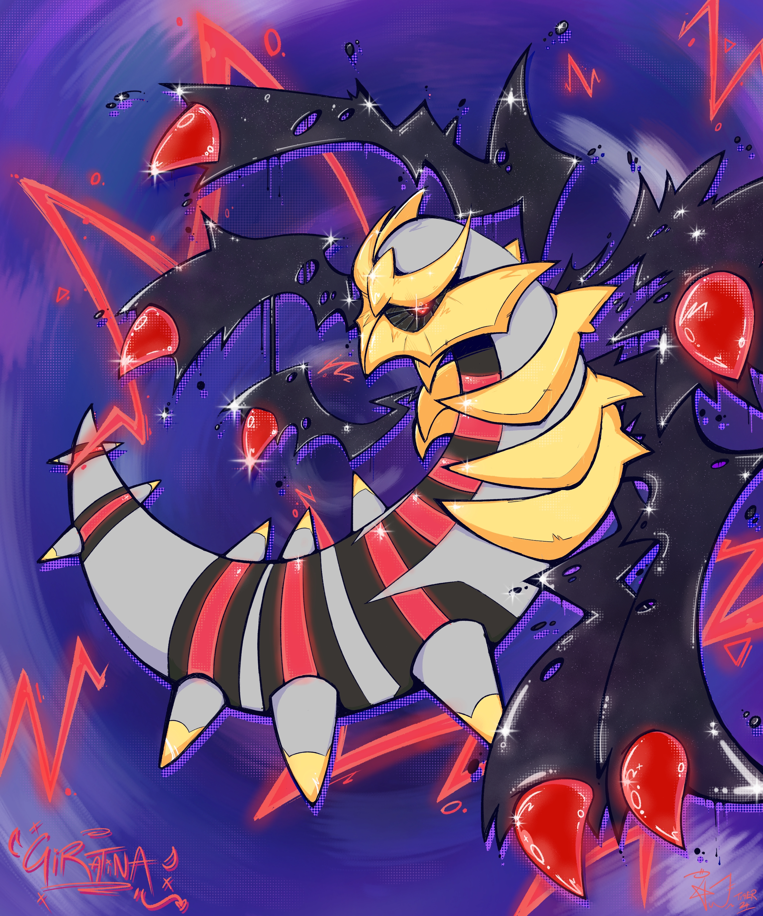 The background is a swirling blue-purple vortex, with streaks of bright red lightning or energy behind or around Giratina as it appears to be emerging from this vortex.