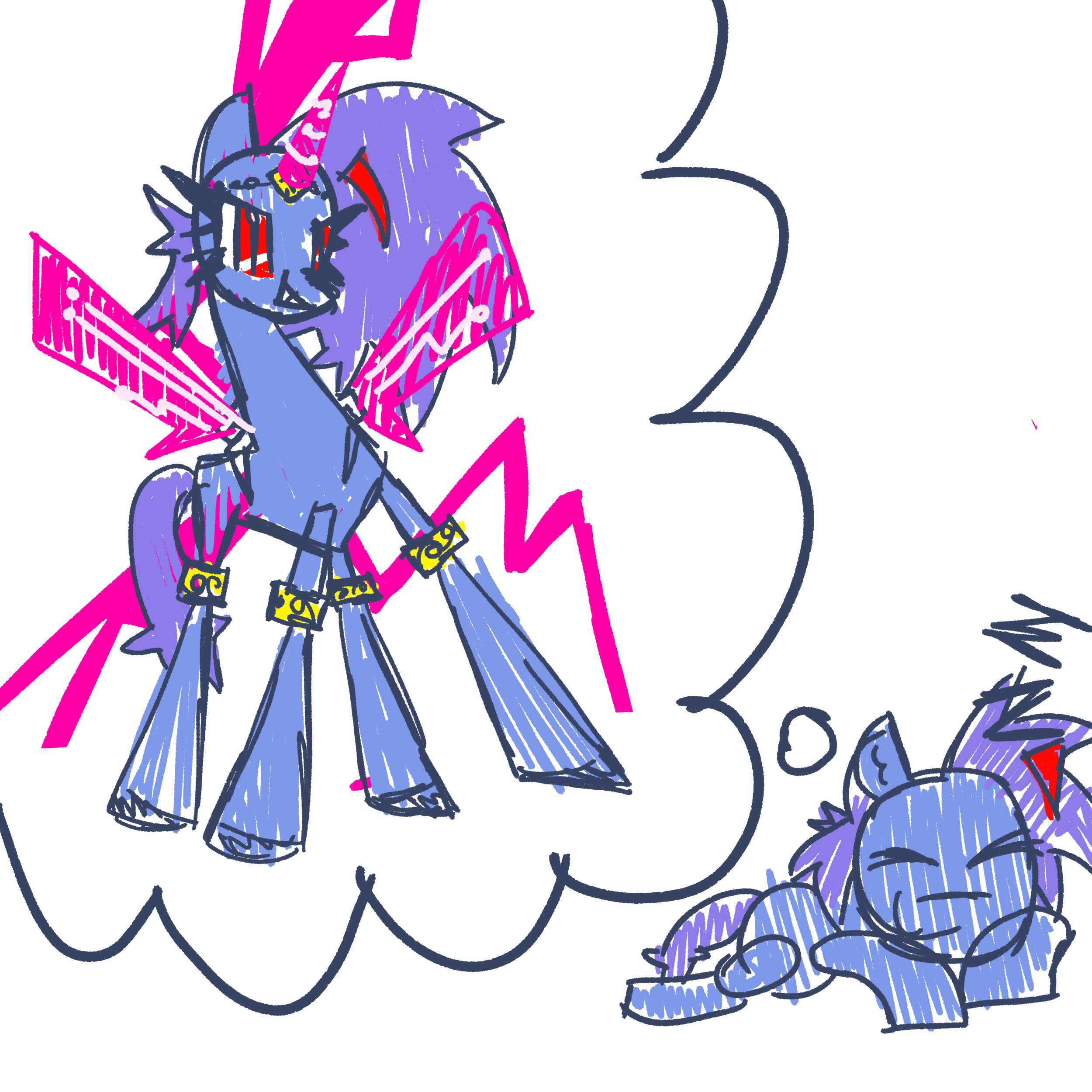 A sketch of Eyesore the pony laying and sleeping with a happy expression. In her dream, she is a super powerful alicorn with purple laser wings and lightning powers.
