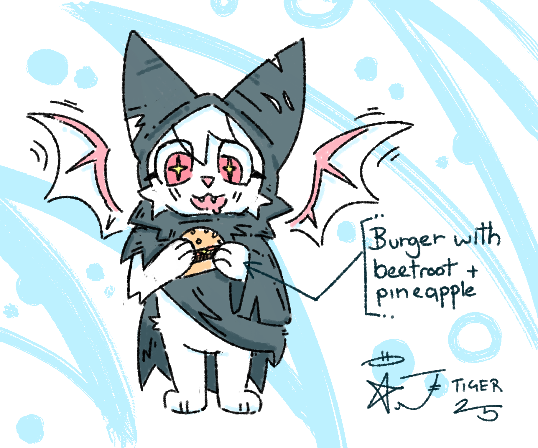 A picture of Fae the albino fruit bat, with a drooling, starry eyed expression, holding a burger. Her wings are out and twitching excitedly, and an annotation pointing to the burger says "Burger with beetroot + pineapple".