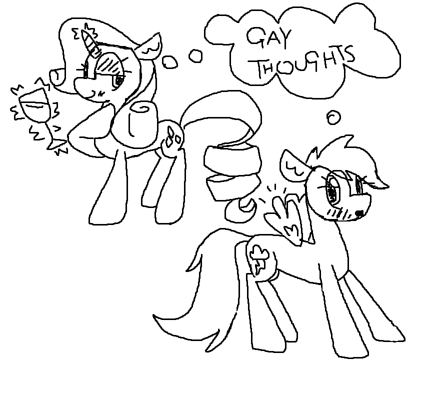 An MS-Paint picture of Rarity, holding a wineglass in her magic and looking at Rainbow Dash with a sultry expression, as well as Rainbow Dash, looking at Rarity with a surprised expression and her wings perked up. A thought bubble they are both sharing says "Gay thoughts".