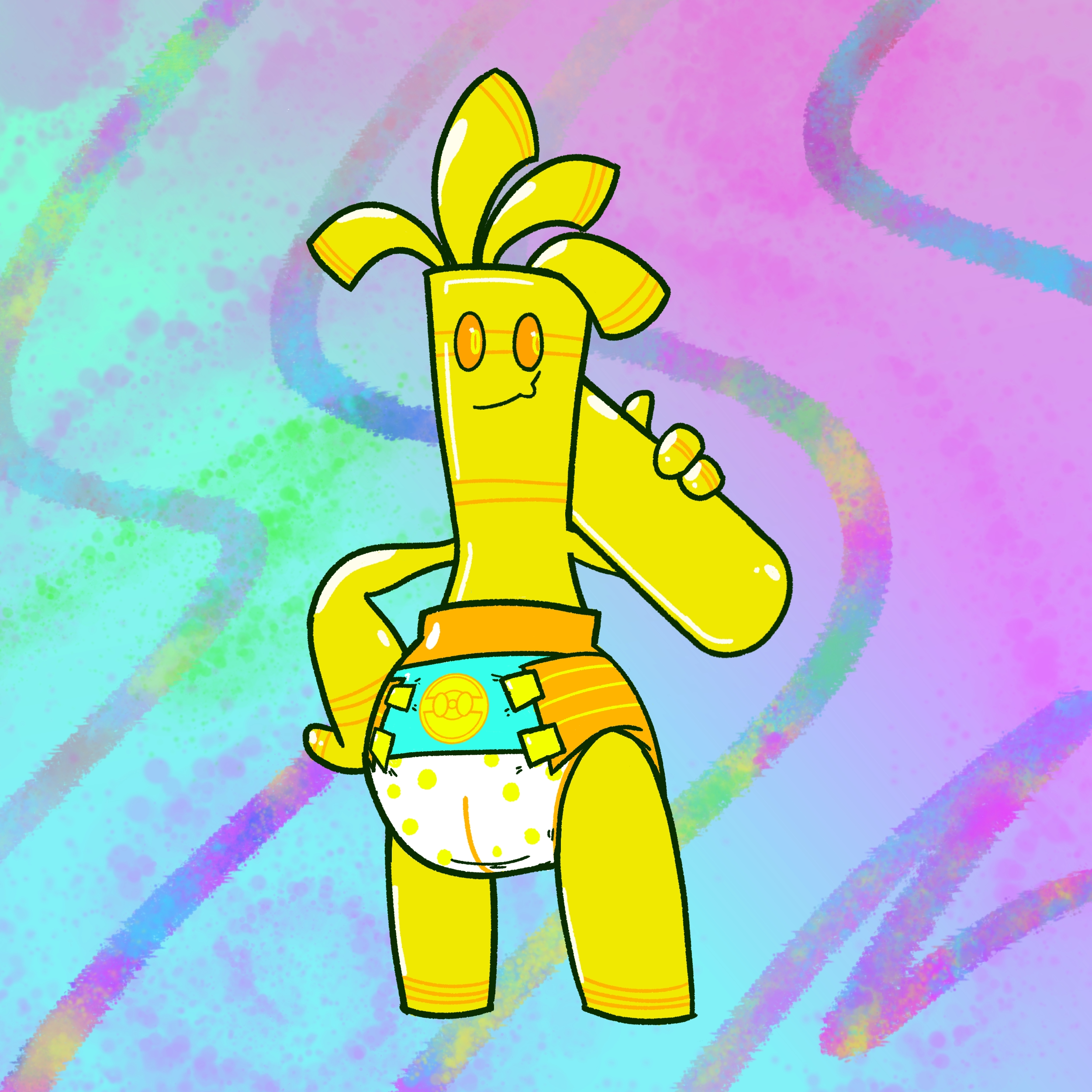 A picture of the Pokemon Gholdengo, wearing a diaper. They are holding their "surfboard" over their shoulder, and have a smiling expression looking off to the right.
