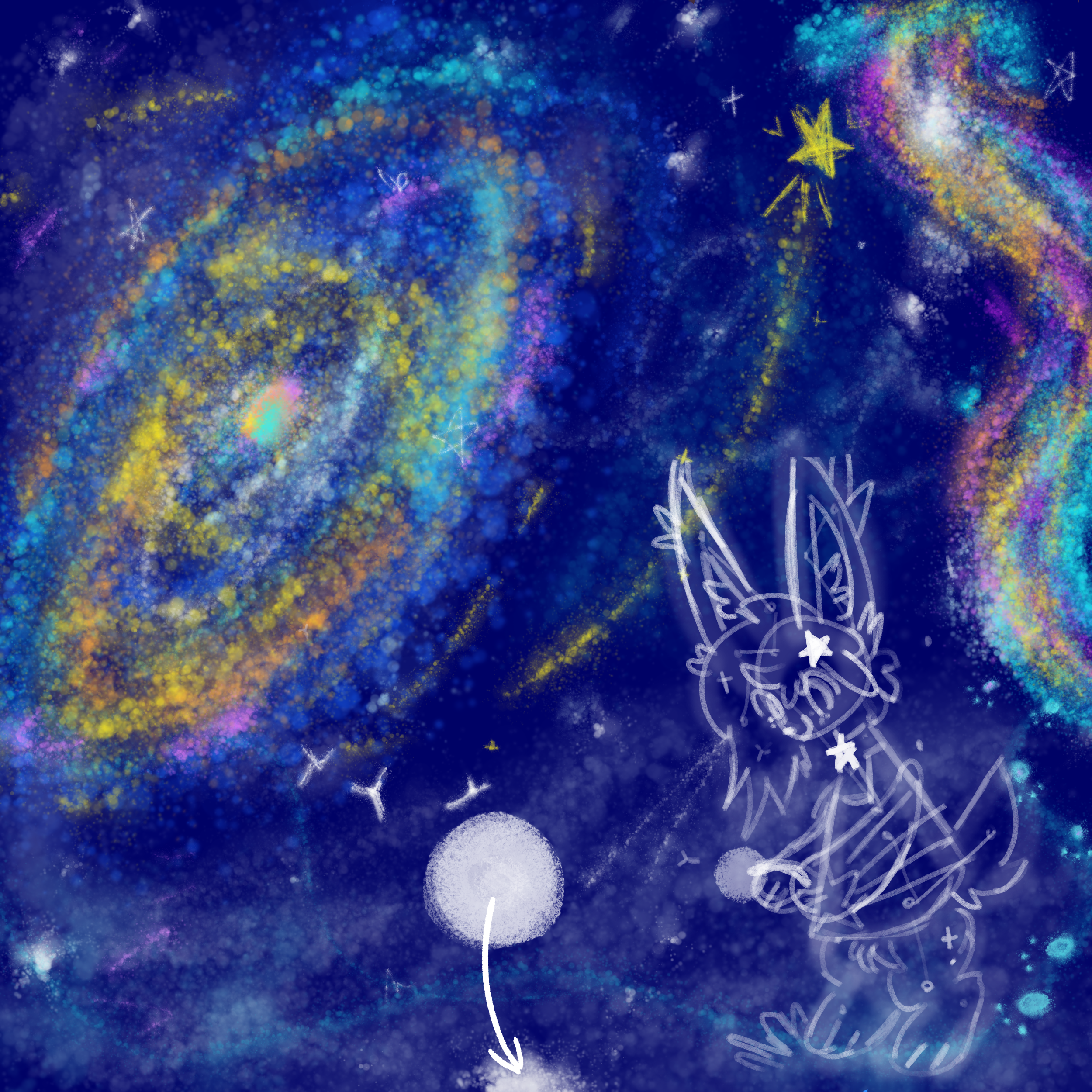 A picture of Aster the star-bunny, picking space dandelions in space. There is a spiral galaxy, a shooting star and a starry nebula in the background.