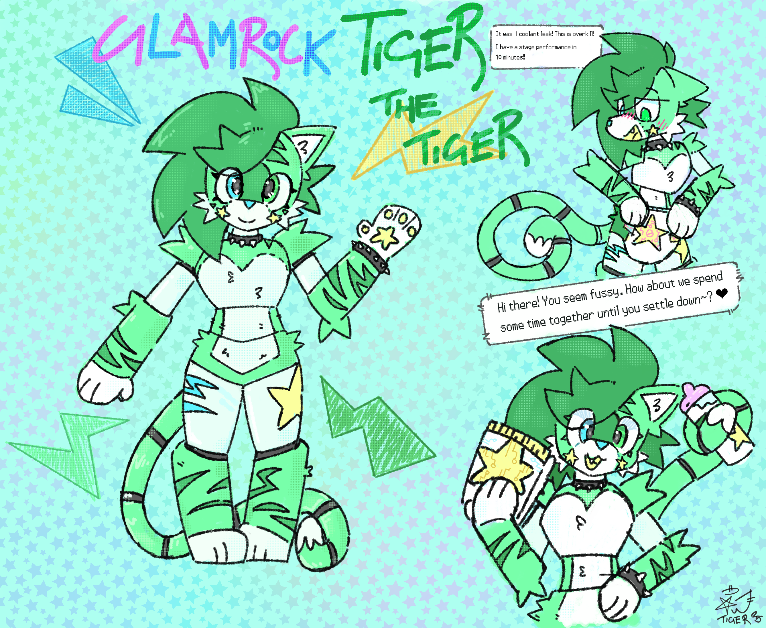 A FNAF Glamrock-animatronic version of Tiger, titled "Glamrock Tiger The Tiger". She's smiling and holding her paw up like she's waving, robotically stiff. She has a long, mechanical segmented tail, distinctly seperate limbs and waist and hips, and her eyes have an inner glow. Her chest and stomach regions are plush and soft, while the rest of her is sleek metal.