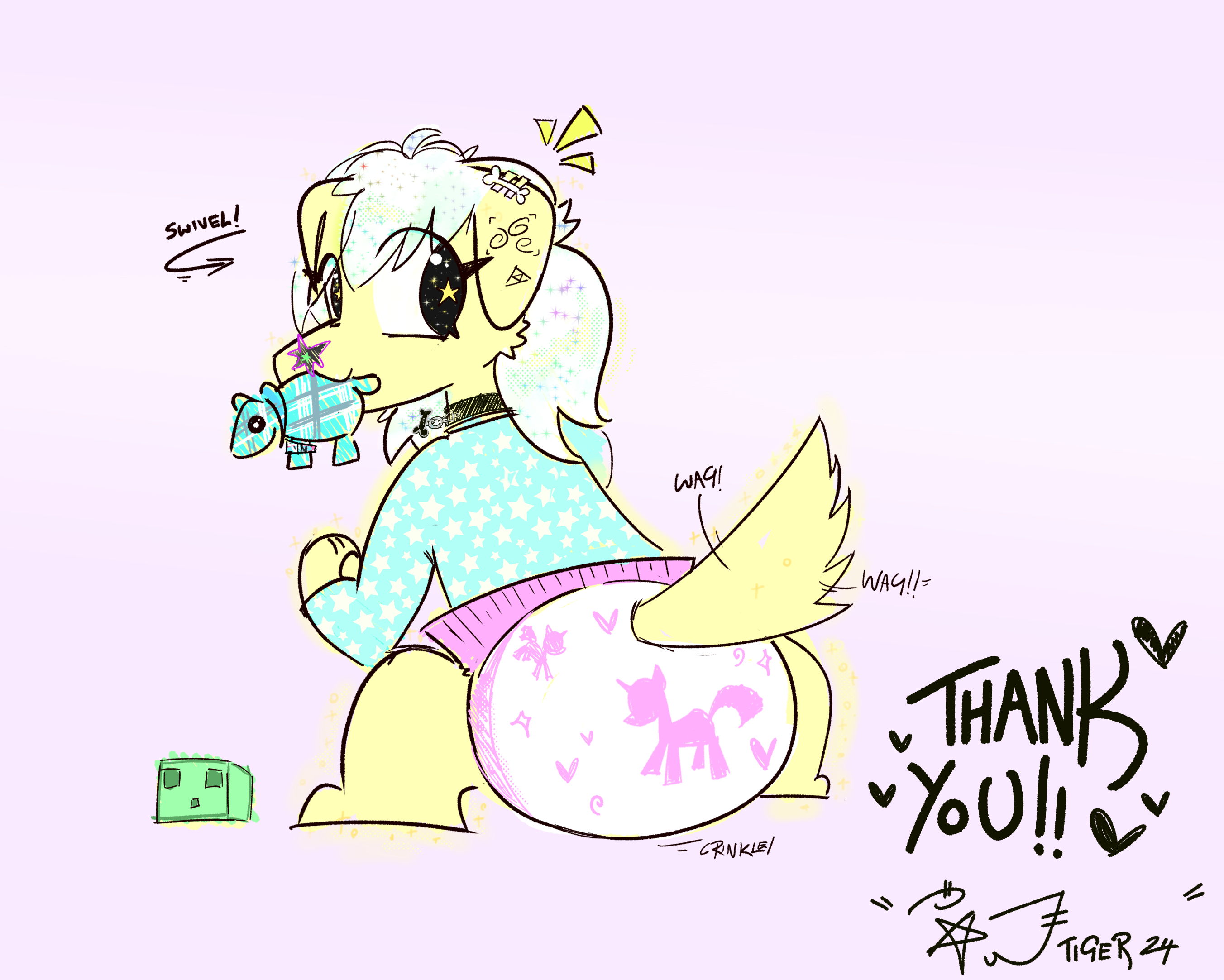 A picture of Ily the dog creature - with a mole like nose and a split left ear, as well as symbols along her right ear. She has a plaid dinosaur chewtoy in her muzzle and is looking over her shoulder, while wagging. She wears a collar, and a diaper with bright pink unicorn designs.