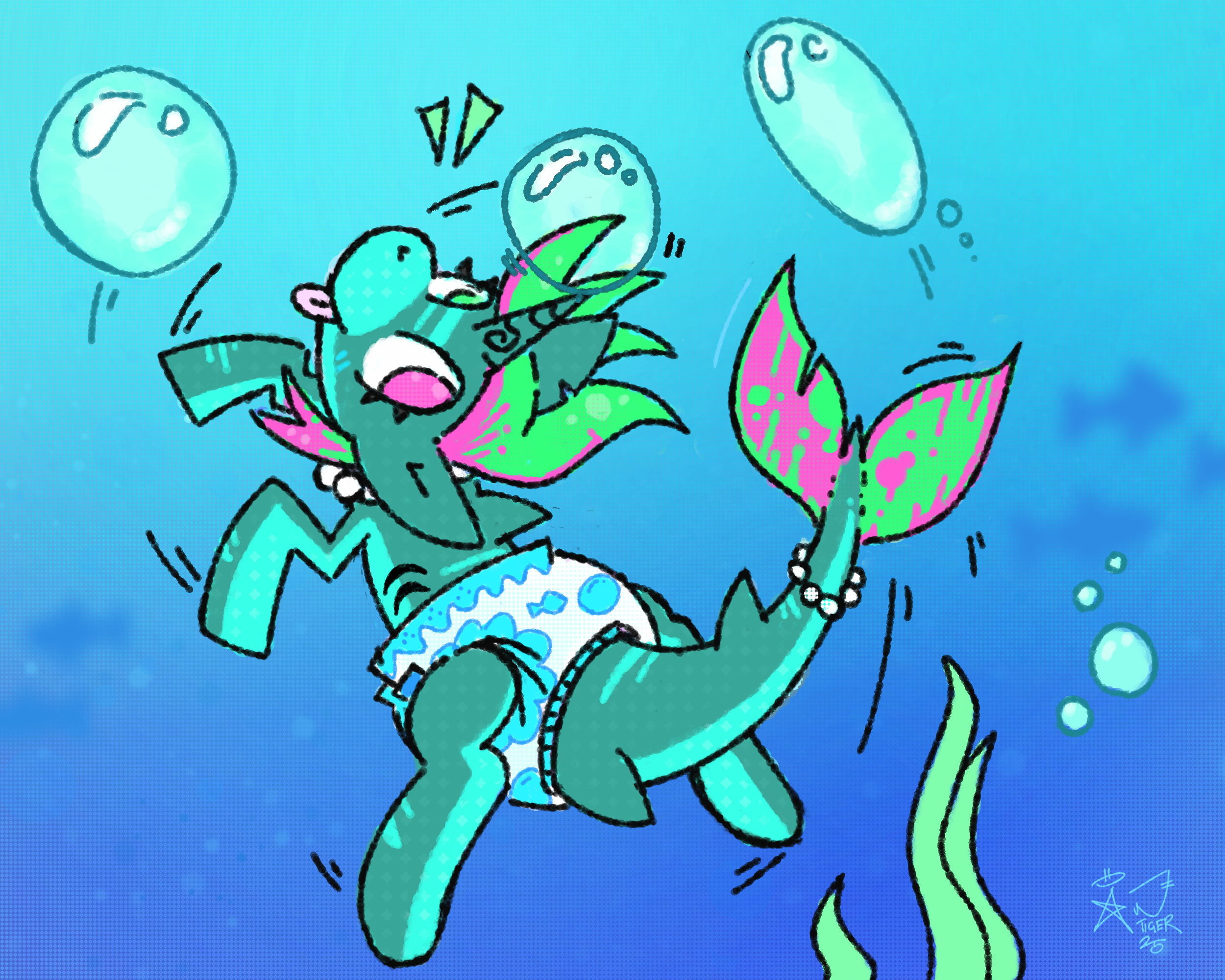 A picture of Kelpie, the shark-unicorn pony. She has a two-tone teal body - predominantly deep teal with a light teal underbelly and stripe. Her fin and mane are bright pink and green, with her fins in alternating colors and patterns - her eyes also heterochromatic pink and green. She is wearing a swim diaper with blue bubbles and fish on it, as well as pearls around her neck and the base of her tailfin. She is juggling bubbles with her tail and horn, with her tongue poking out, looking almost upside down back at the viewer. The background is a simple blue oceans pace with shadows of fish in the background, and some bubbles and kelp.