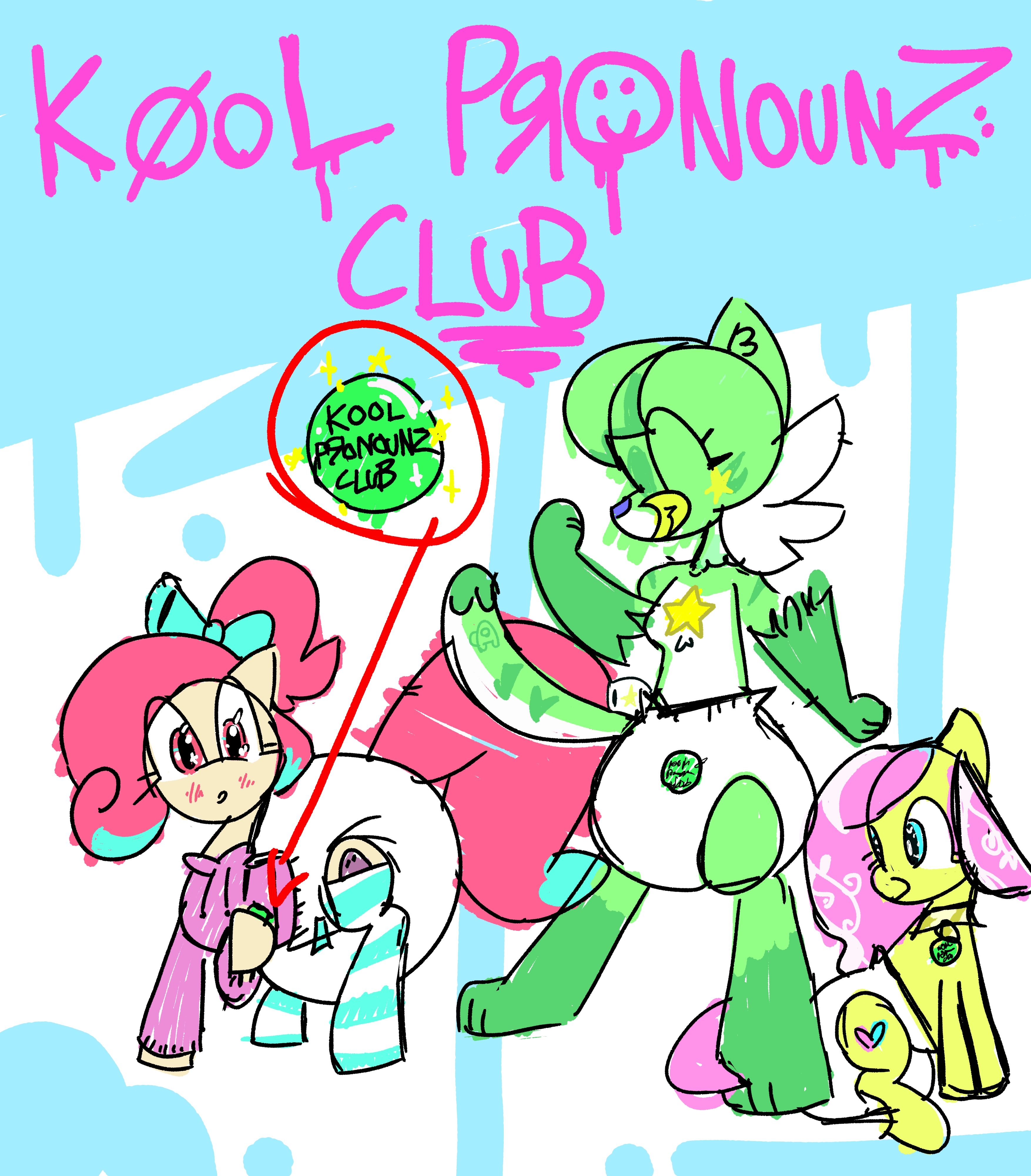 A picture of Tiger, Silky and Rosy the pony, all wearing plain white diapers. Rosy has been given a "Kool Pronounz Club" pin and is looking at it with a mystified expression. Tiger has a happy grin and is wearing her pin on her diaper, while Silky is laying and smiling with hers attached to her gold collar. Above them, the words "K0OL PRONOUNZ CLUB" are written in paint dripping letters."