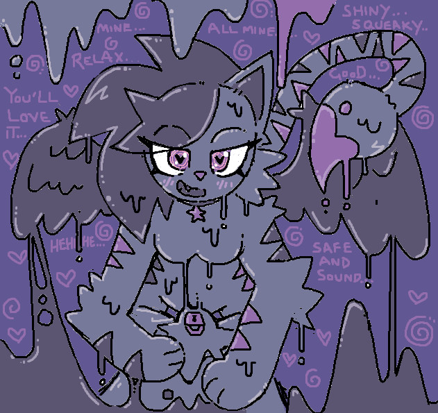 In the background, text surrounded by swirls and hearts reads: shiny... squeaky... mine... relax... safe and sound... you'll love it... all mine... hehehehe....