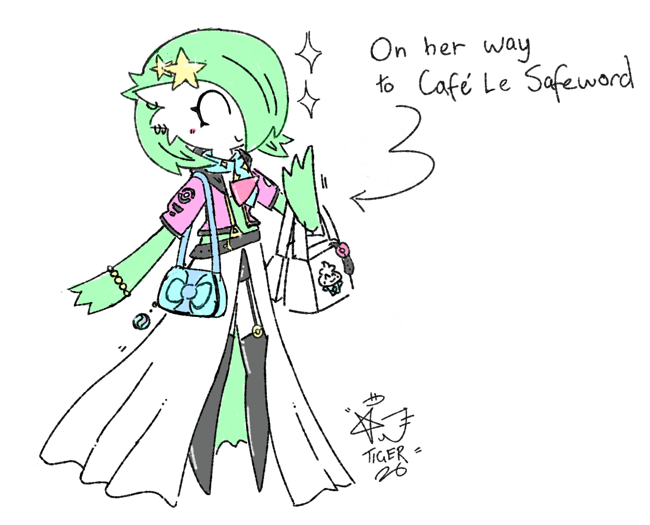 A sketch of a Gardevoir wearing human fashions, holding a pair of shopping bags. She has a pair of star-shaped hair clips, a blue scarf with yellow sparkles, a pink-and-black jacket, a blue purse with a Gardevoirite hanging from it, a belt, a black latex garter belt and stockings with golden Poké-ball clasps. The shopping bags have a Vanillite logo on them, and a Poké-ballgag hanging out of one. She is smiling with a closed eye expression and light blush.