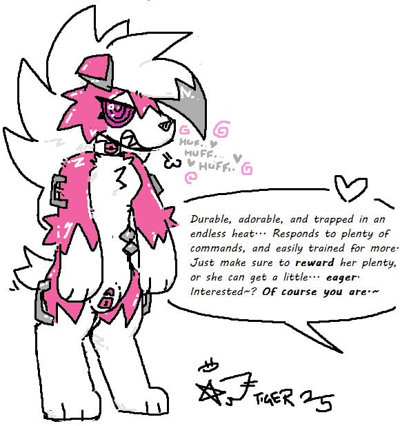 Dialogue from offscreen reads: Durable, adorable, and trapped in an endless heat...Responds to plenty of commands, and easily trained for more. Just make sure to reward her plenty, or she can get a little... Eager. Interested~? Of course you are.~