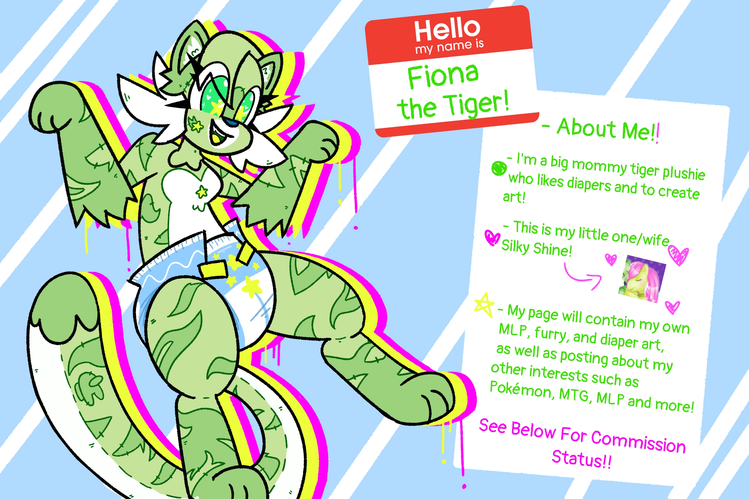 There is a box of explanatory text on the right sie of the image formatted into bullet points. The bullet points read "About me!!", "I'm a big mommy tiger plushie who likes diapers and to create art!", "This is my little one/wife Silky Shine!" (with an arrow pointing to an image of Silky Shine), "My page will contain my own MLP, furry, and diaper art, as well as posting about my other interests such as Pokémon, MTG, MLP and more!" and "See Below For Commission Status!!".
