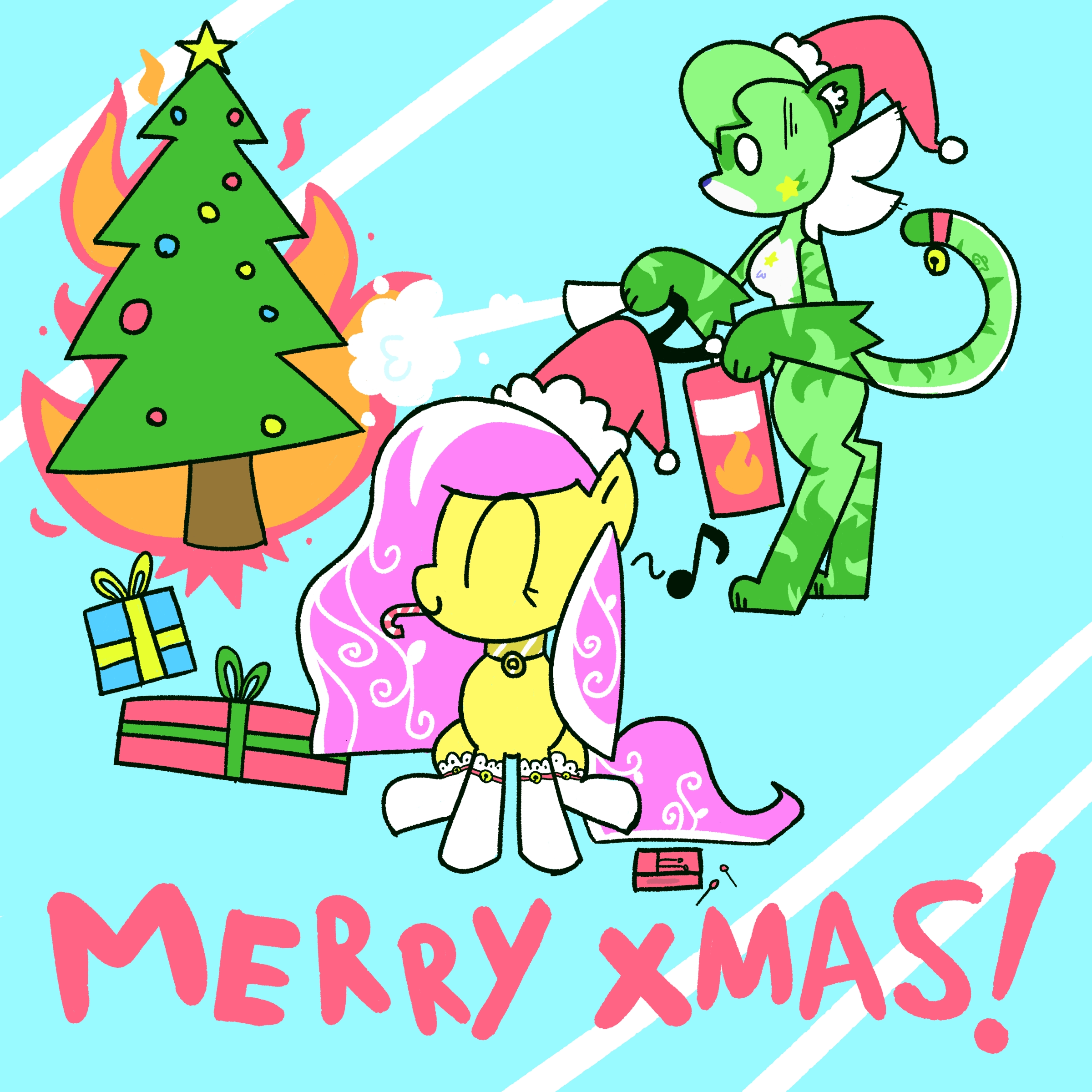 A picture of Silky Shine standing in front of a burning christmas tree, while Tiger puts out the fire behind her. Silky is wearing a santa's hat and white socks with bells. She has an innocent, happy expression with a candy-cane in her mouth, while an open matchbox sits beside her. Tiger is wearing a santa's hat and a bell on the end of her tail, and has a mortified expression as she aims and uses a fire-extinguisher on the burning christmas tree. There are two gifts beneath the tree.