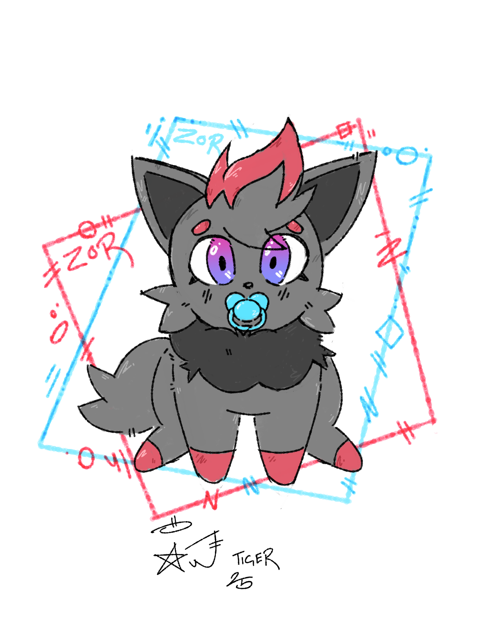 A picture of Moody as a Zorua - A scruffy zorua with eyes that go from a gradient purple to pink. He has a blue pacifier in his mouth and is lightly blushing.