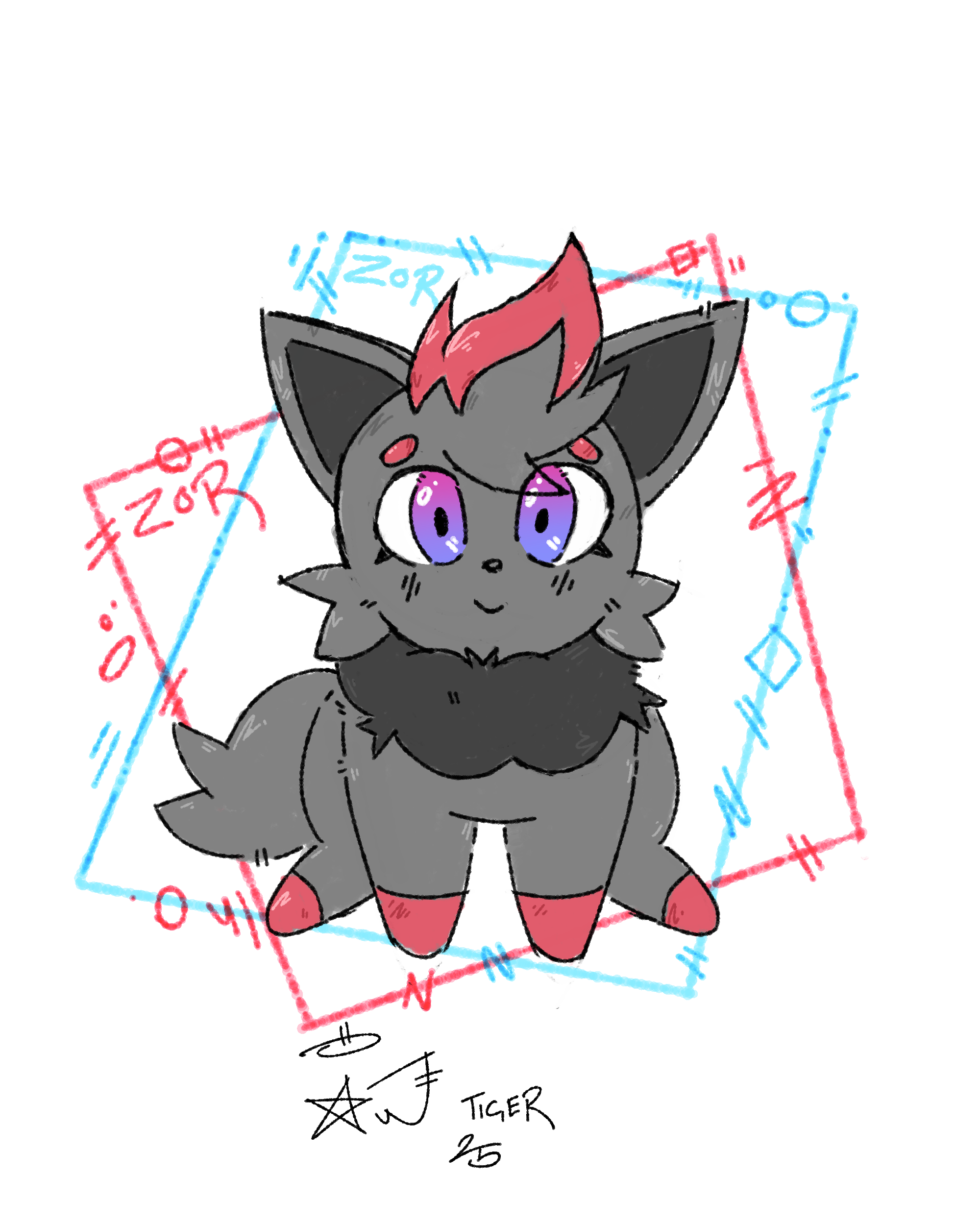 A picture of Moody as a Zorua - A scruffy zorua with eyes that go from a gradient purple to pink. He is smiling and is lightly blushing.