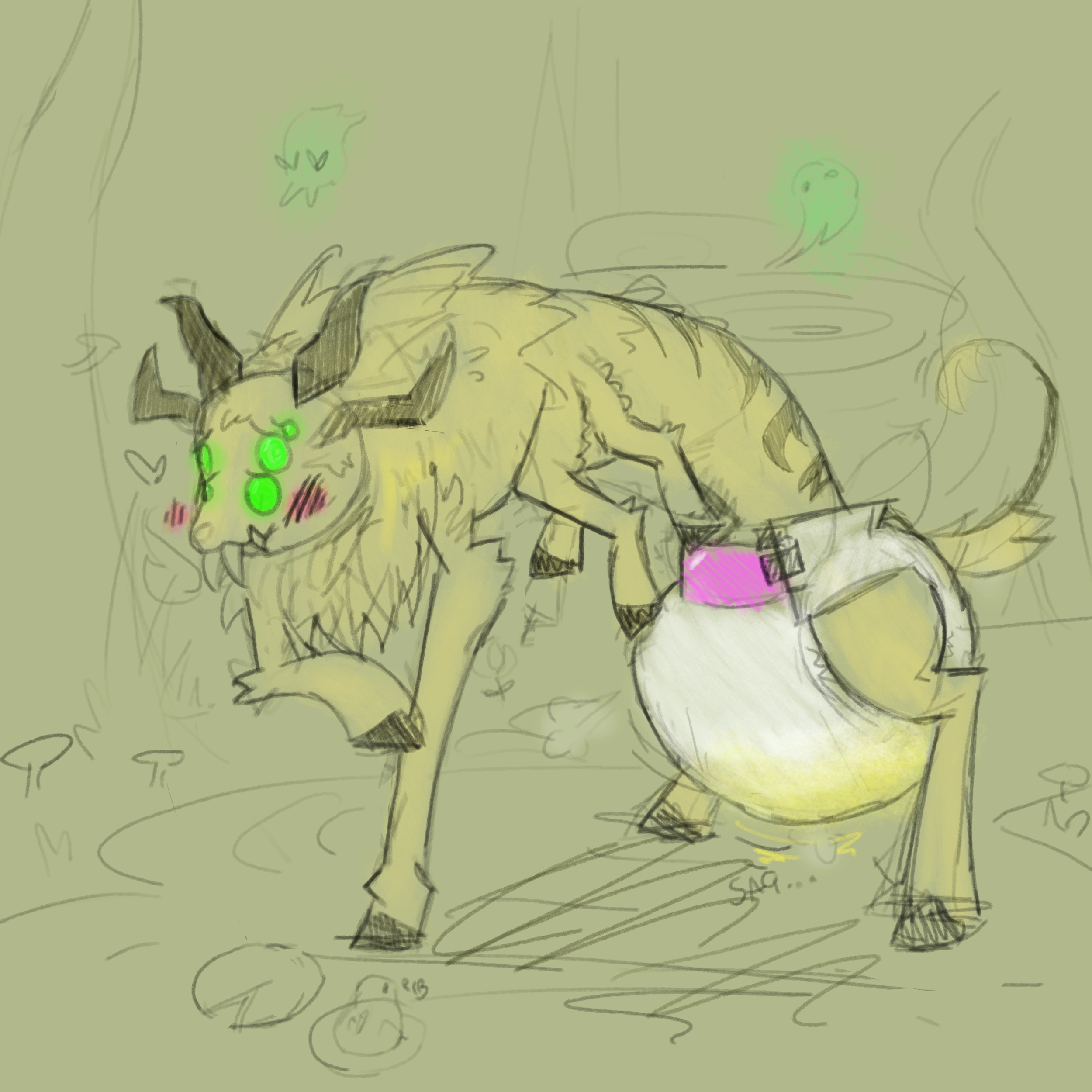A sketch of Nethroi, from Magic the Gathering - a large tan-colored cat beast with eight hooves, antlers and large fangs, as well as three pairs of glowing green eyes - wearing a large wet diaper. The background is a loosely sketched swamp with green souls floating around.