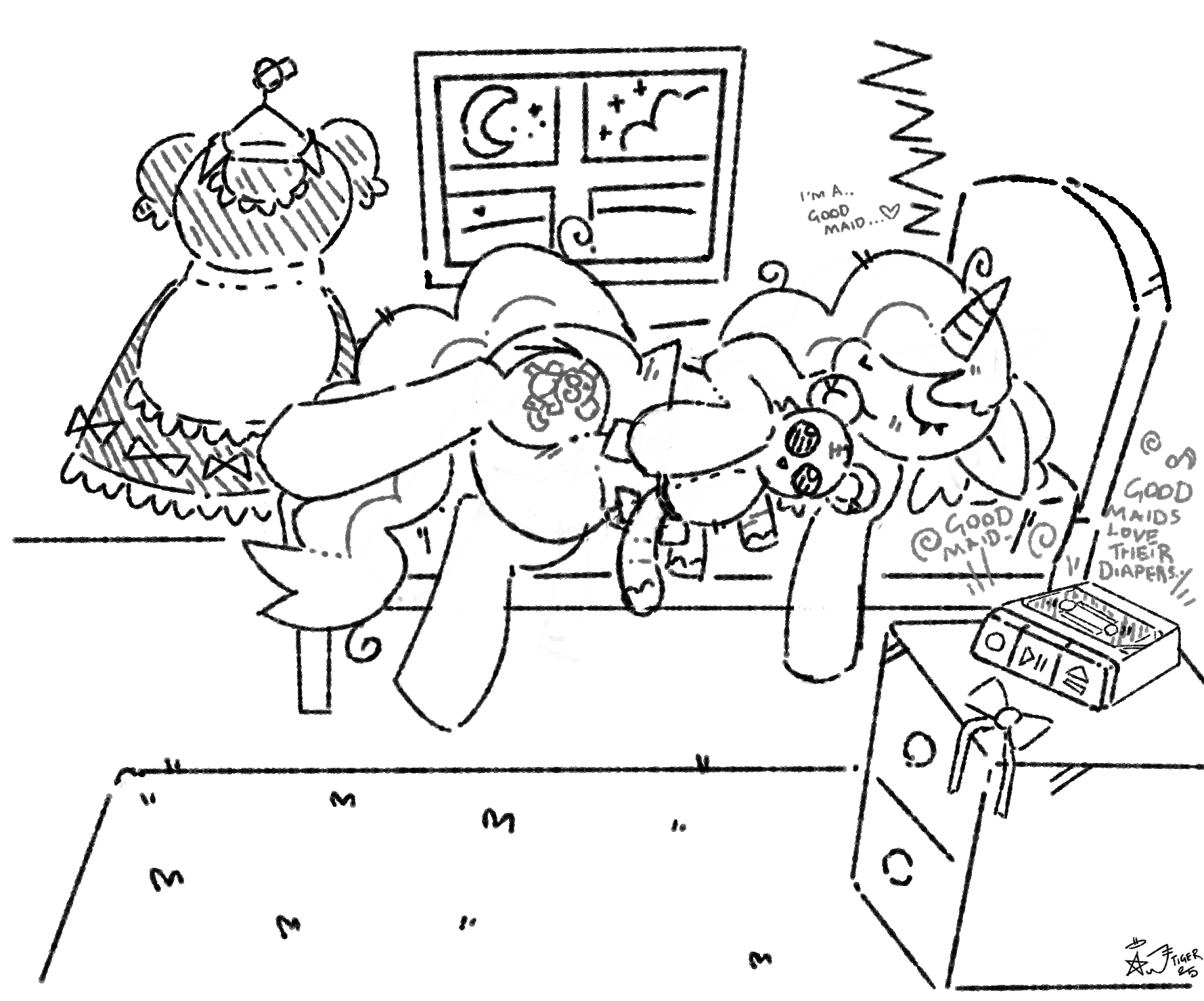 A colorless picture of a My Little Pony OC, Soft Stuff the unicorn maid. She is sleeping on her side in a bed while wearing a diaper and holding a tiger plushie in one hoof, as her other hoof dangles over the side of the bed. On top the bedside drawer, a tape recorder players a tape softly, saying "GOOD MAIDS LOVE THEIR DIAPERS..." and "GOOD MAID...". Soft Stuff mutters in her sleep, "I'm a... Good maid...❤️"