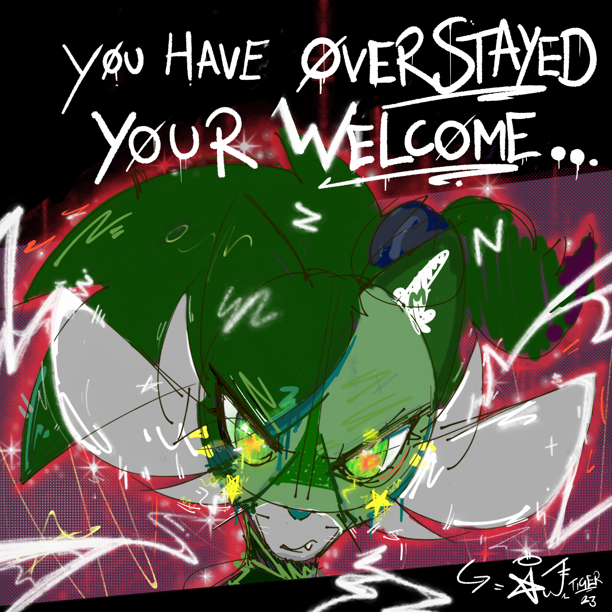 Text above Tiger reads: Y0U HAVE 0VERSTAYED Y0UR WELC0ME...