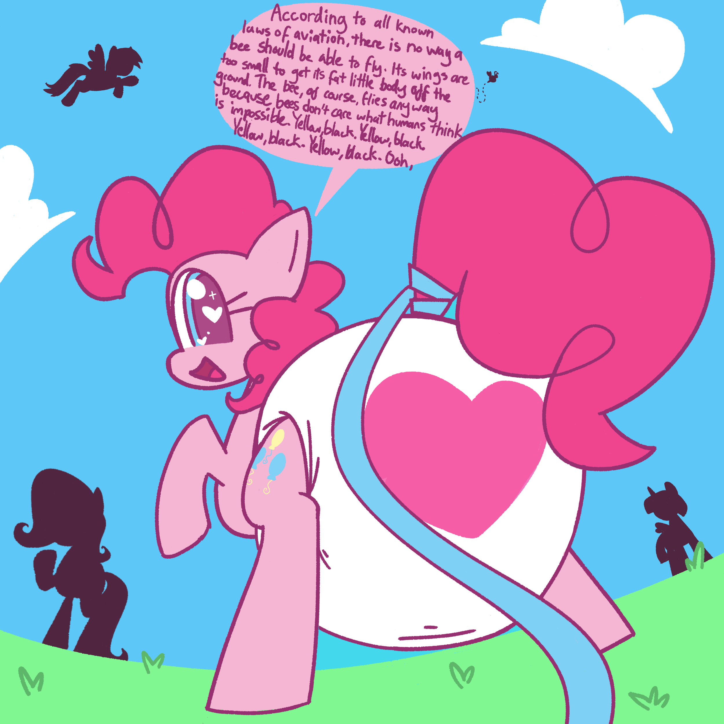 A picture of Pinkie Pie, wearing a large diaper with a heart on it, and a blue leash tied to the base her tail which is attached to the viewer. She is standing outside, with the silhouettes of ponies (Twilight, Fluttershy and Rainbow Dash) looking at her from the ground and sky. She smiles and looks over her shoulder.