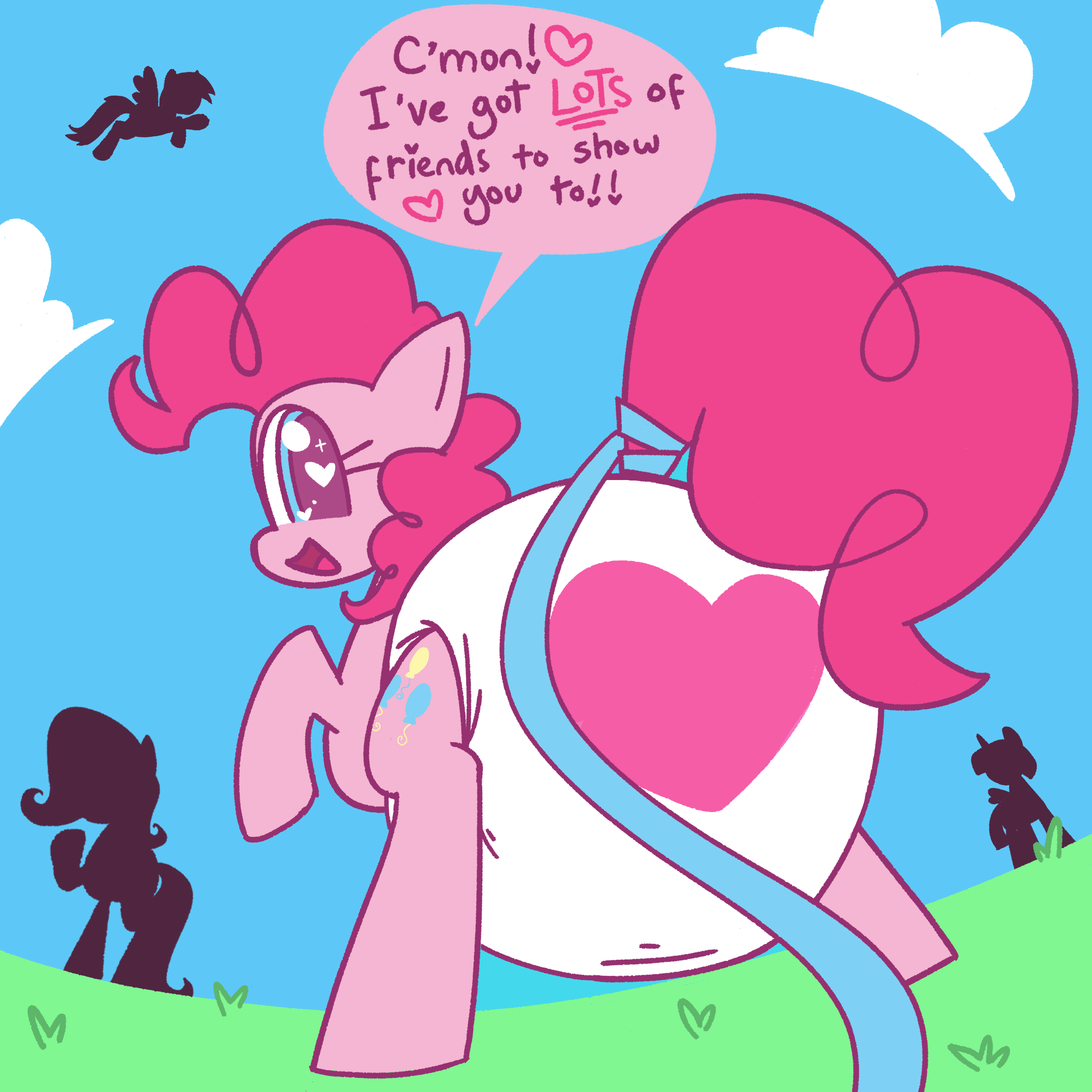Dialogue from Pinkie reads: C'mon! I've got LOTS of friends to show you to!!