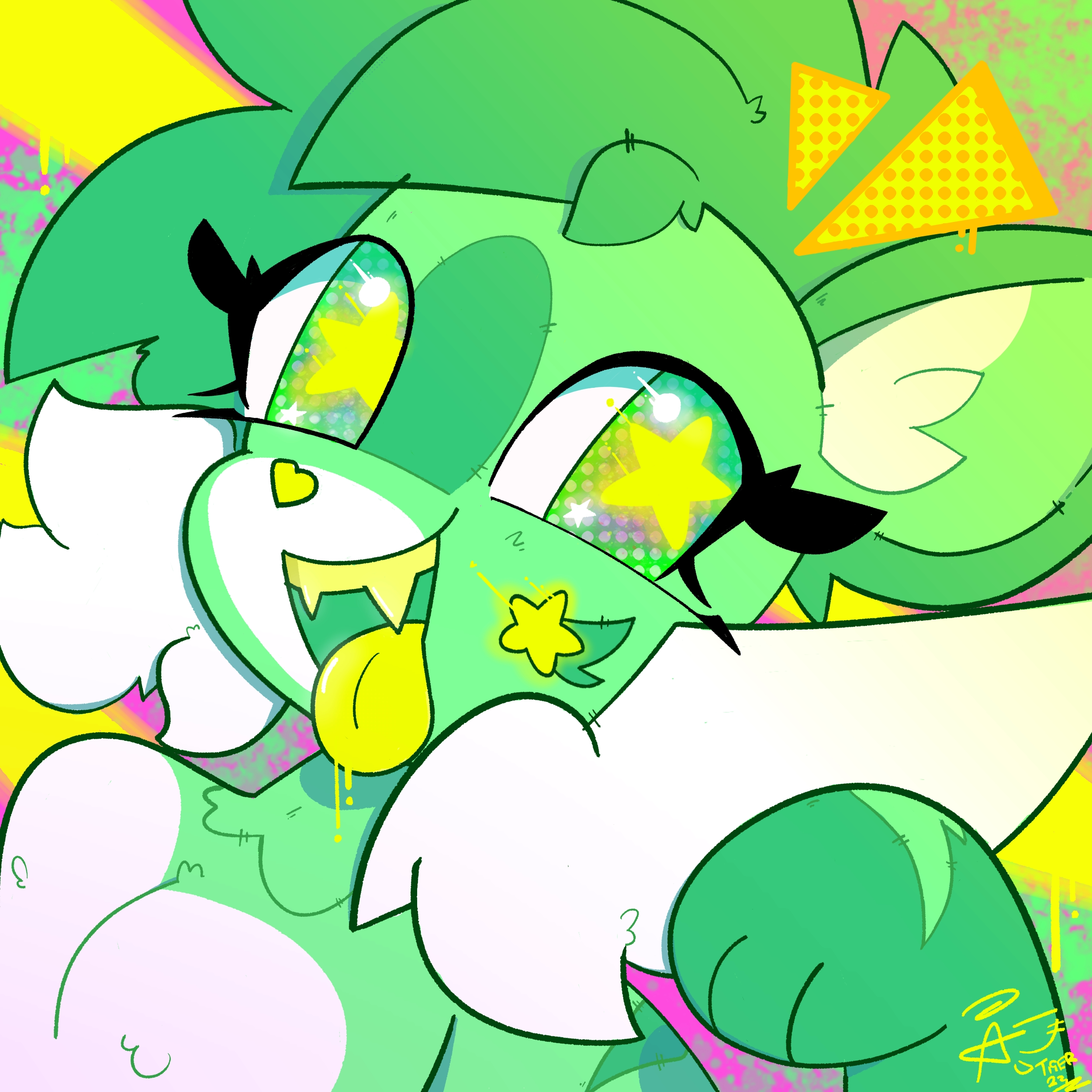 A profile picture of Tiger. She has her yellow tongue lolled out, dripping yellow paint. Her pupils are large shiny stars, and she has a happy expression. Action lines make her appear to be in motion, with a paw raised to her side.