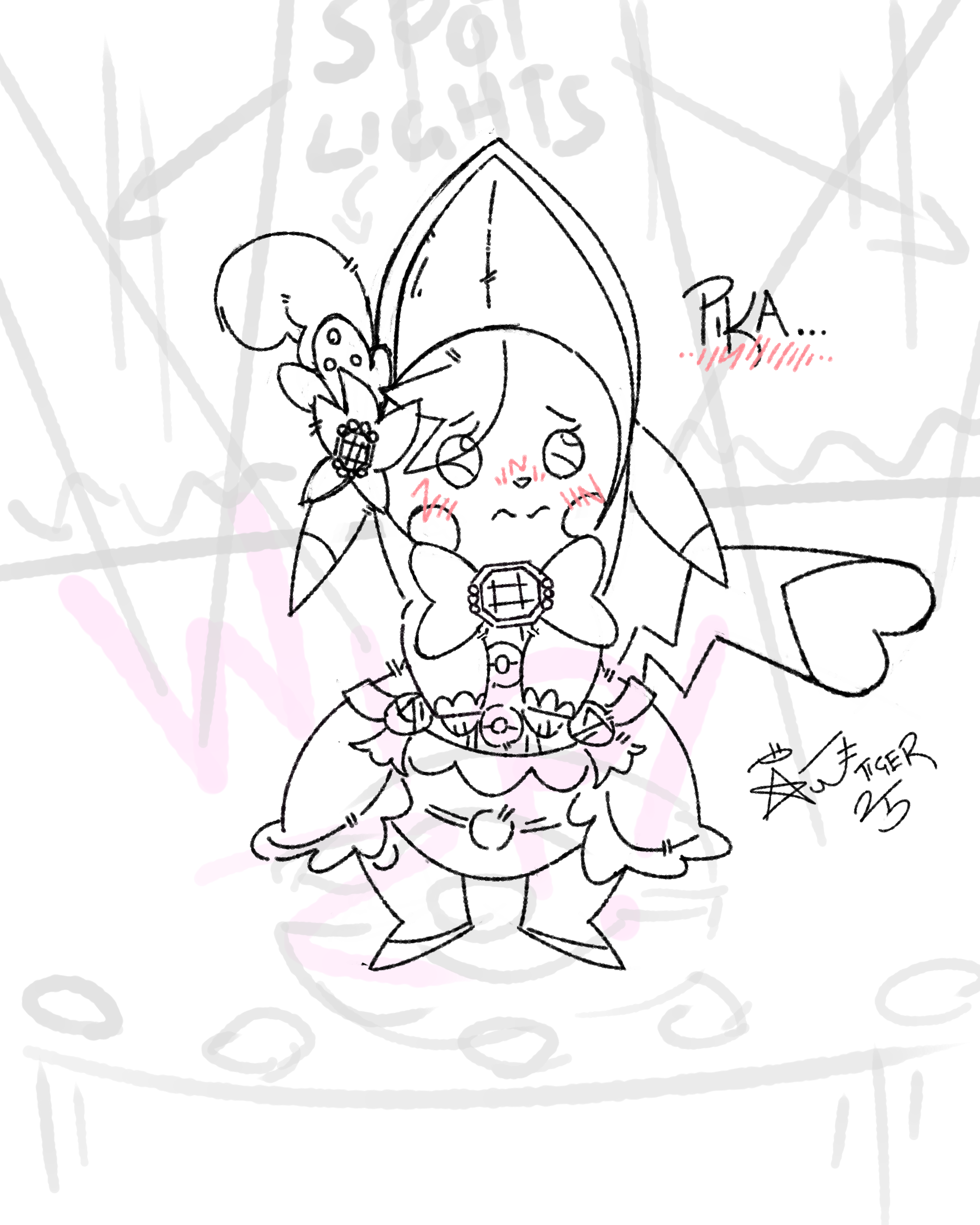 A picture of Tiger, turned into a Pikachu and dressed in the Pikachu Belle outfit. She has a blushing, uneasy expression, with her short paws trying to cover her exposed diaper front, but failing. Her ears and tail are folded down shyly. The front of the diaper has a Pokeball motif.