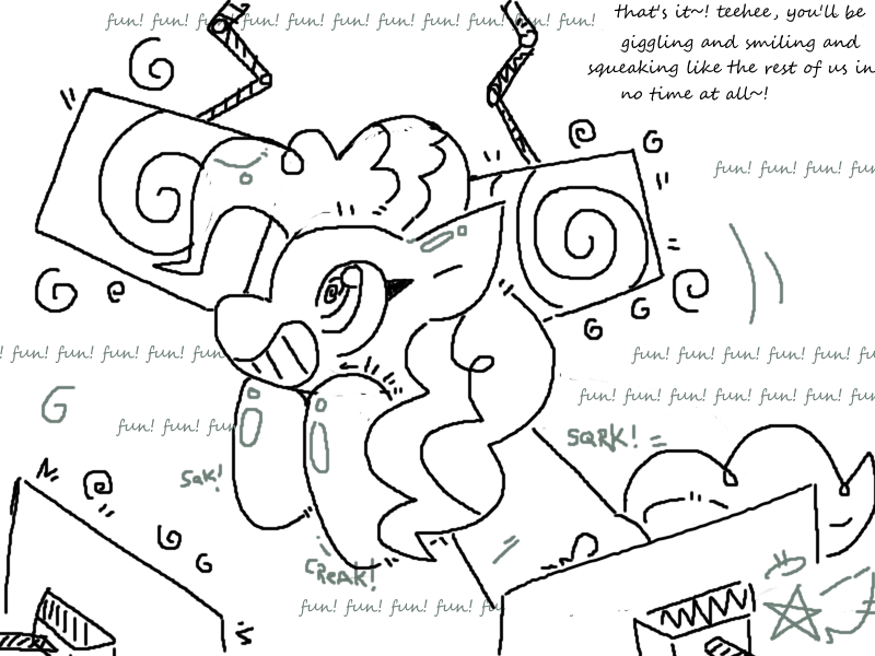 A picture of a rubber Pinkie Pie, surrounded by swirling screens. They have a fixed, wide grinning expression with swirls in their eyes, with their hooves innefectually pooling at the rubber of their cheeks. The screens repeat "fun!" over and over again.
