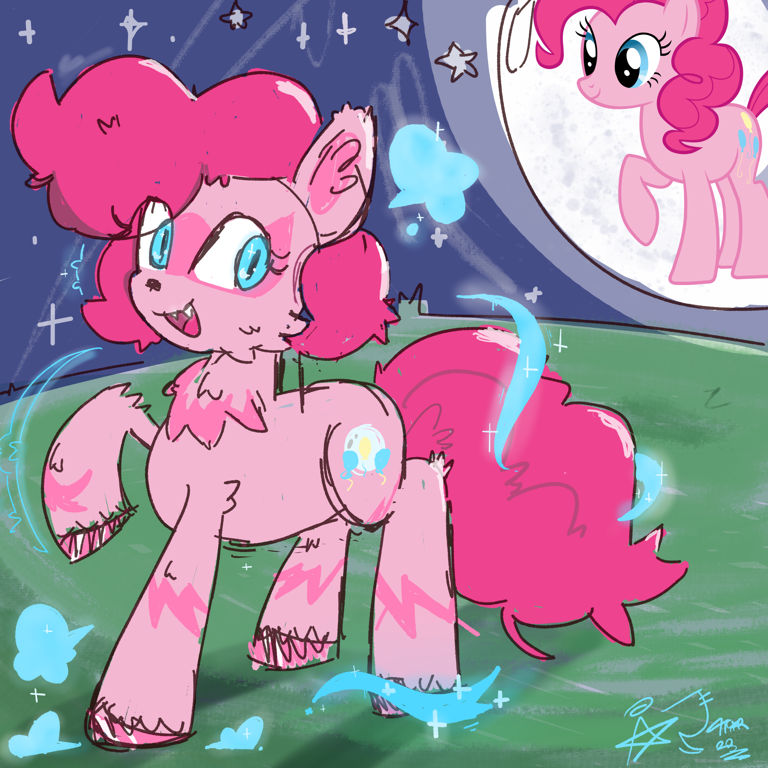 A picture of Pinkie Pie, standing on top of a moonlit grassy hill and being transformed into a werewolf-pony. Blue magics swirl around her in the aftermath of her transformation, which has left her coat more fluffy and scruffy, her hooves with stripey markings, as well as a "mask" like masking around her eyes. She has a small shiny nose with a scruffier mane and tail, as well as glowing blue slitted eyes glowing the same as the magic dissipating from her. Her cutie mark of three balloons now has a moon behind it. The moon hanging over her in the night sky has a stock PNG of Pinkie Pie on it, for some reason.