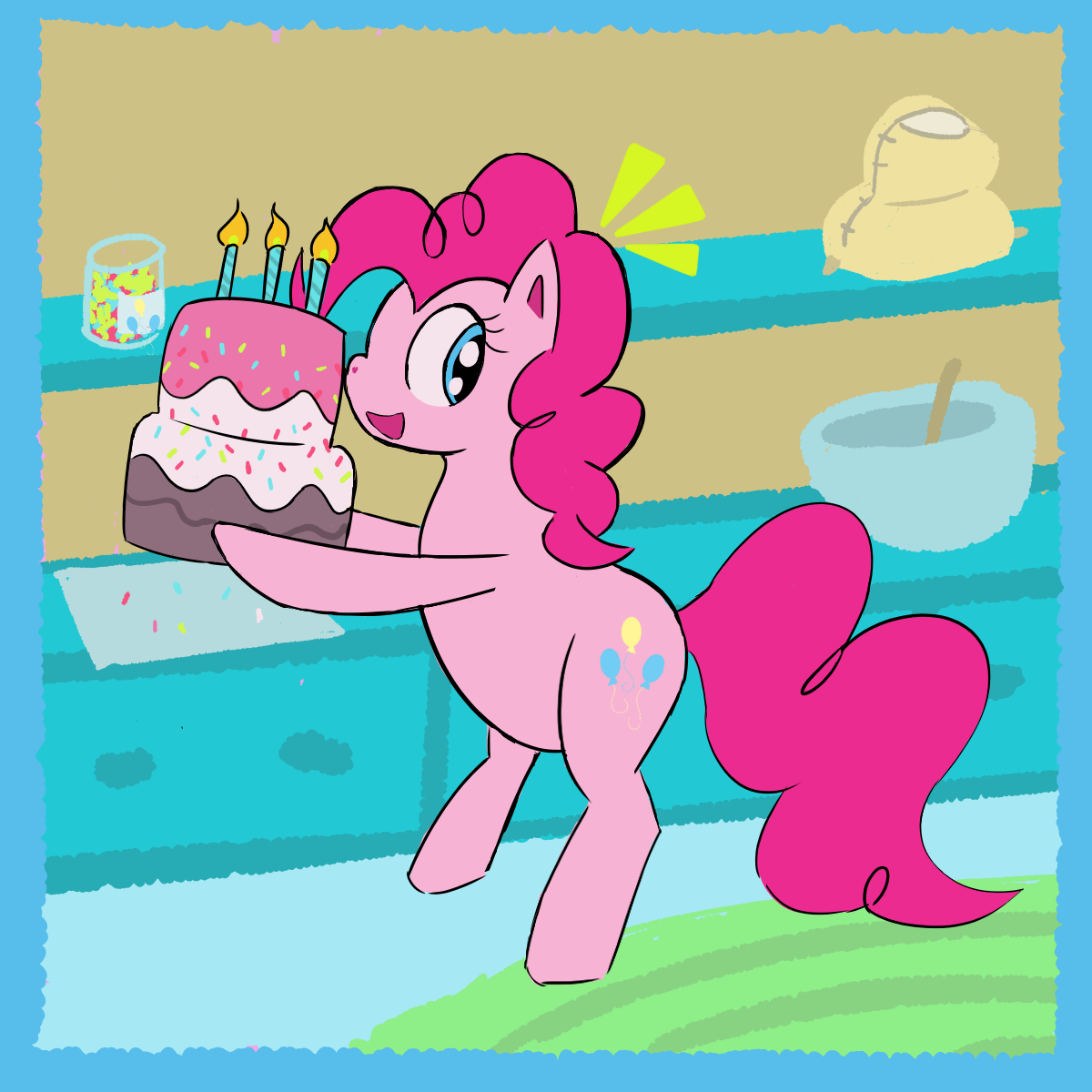 A picture of Pinkie Pie, holding a birthday cake and looking over her shoulder. She is standing in a kitchen with flour, a mixing bowl and glitter, and has a happy expression.