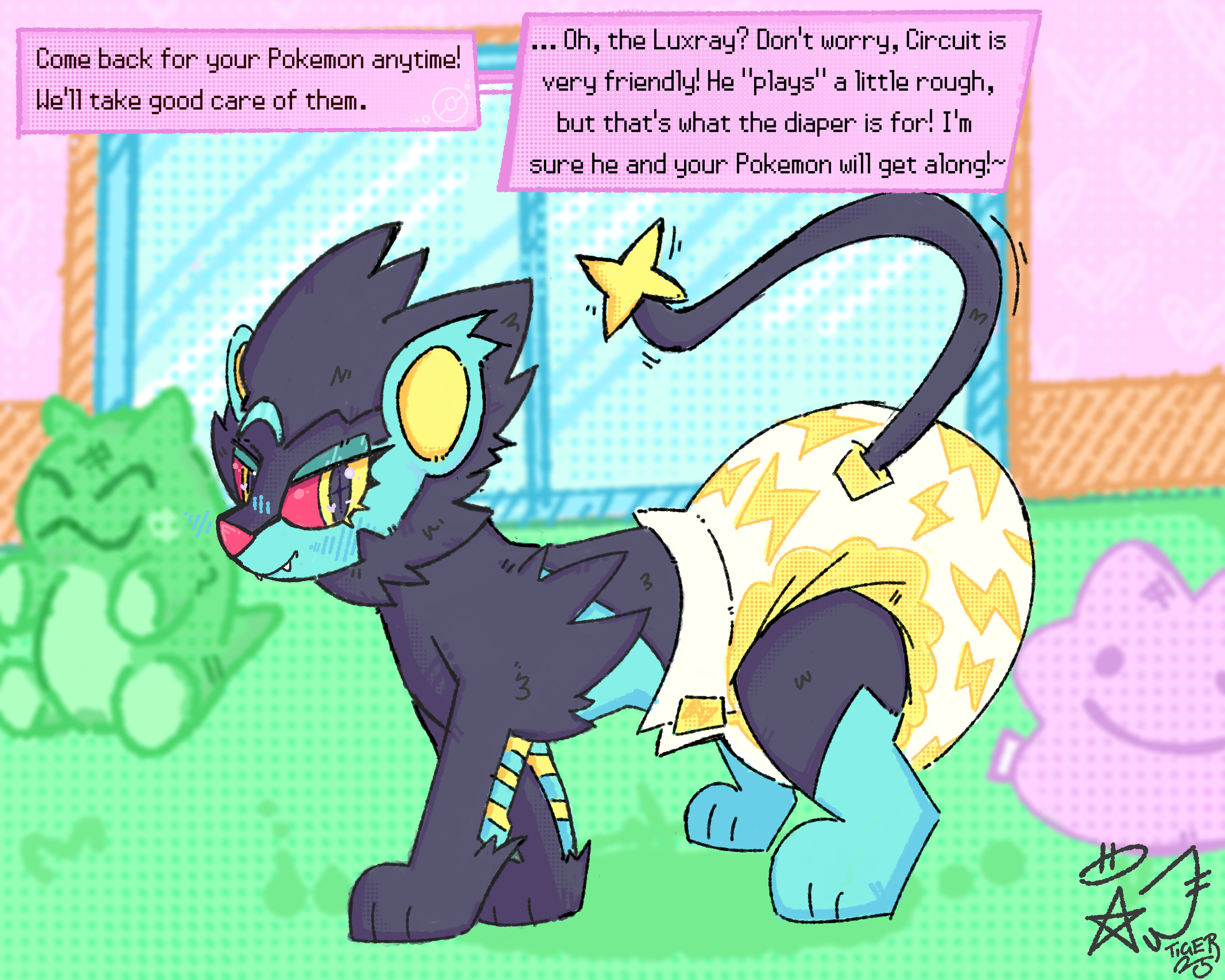 A picture of Circuit the Luxray, wearing a diaper, prowling inside of a Pokemon Daycare. He has a smug expression on his face, eyes fixed on the viewer while he blushes and grins and his tail flicks behind him. His diaper is large and white, with yellow lightning bolts, leakguards and tapes.