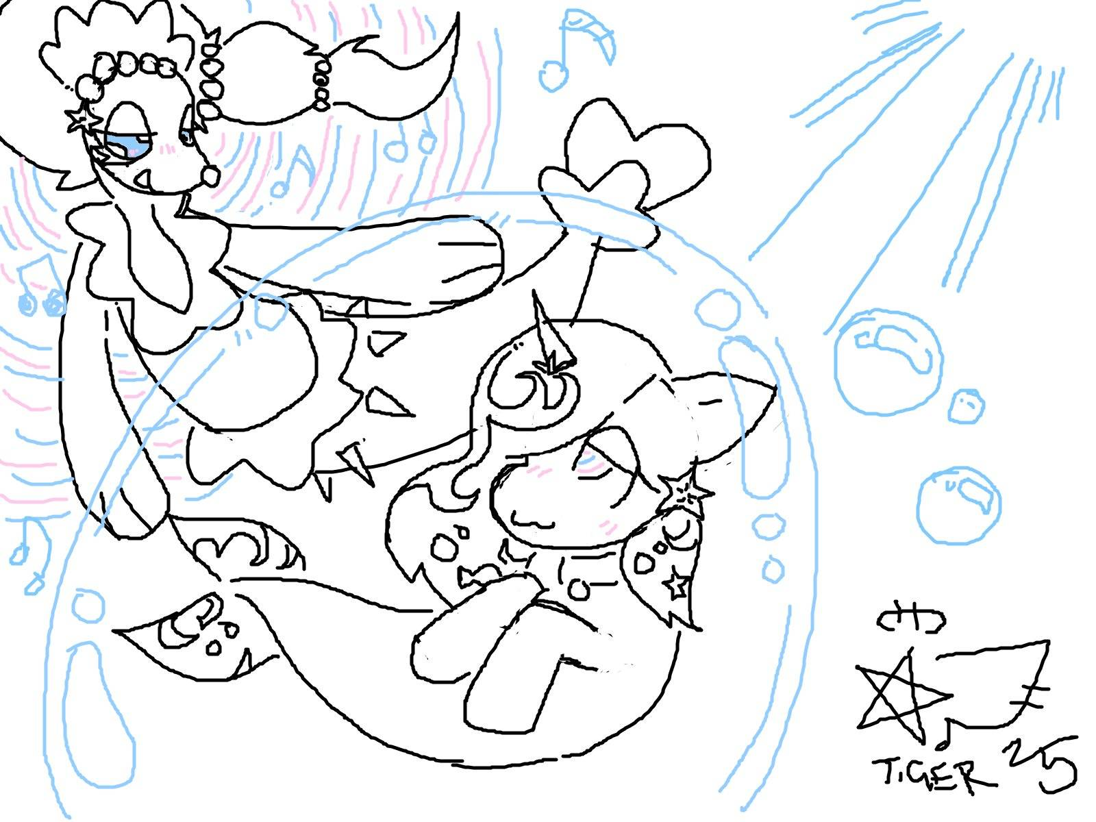 An MS-Paint picture of Silky Shine underwater as a seapony, inside of a bubble while a Primarina floats beside her, singing. Silky Shine has pink-and-blue swirls in her eyes, the same as the song-waves coming off of Primarina. Her sea-pony tailfin is patterned like her mane, which also has more bubbly and fish markings than normal.