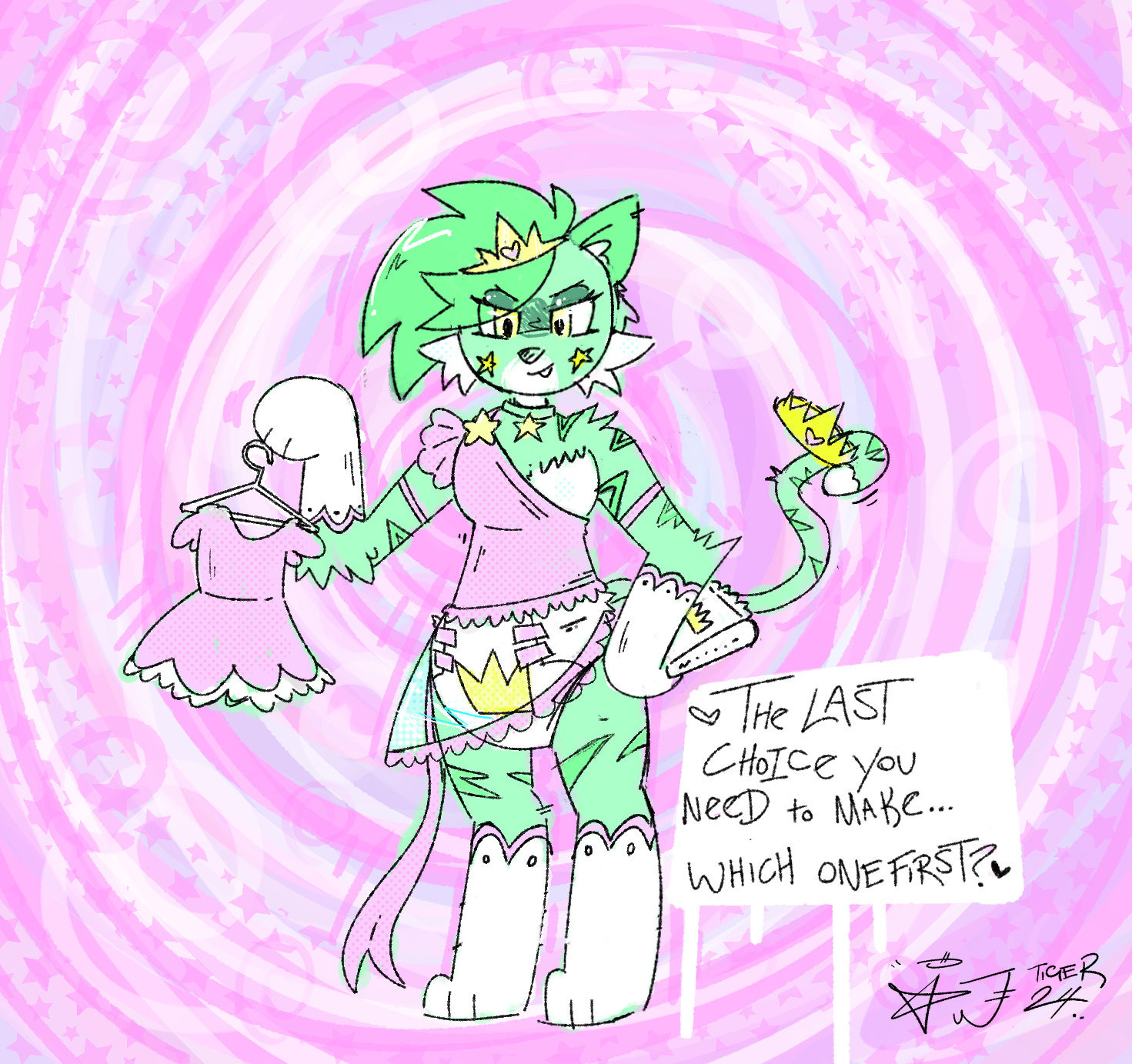 A picture of Tiger, dressed like a Princess in a fancy pink dress with a see-through skirt, white fancy gloves and white fancy socks - as well as a diaper with a crown motif on the front. She has a crown on her head, and one in clutched in the end of her tail. In one hand, she holds out a cute pink dress, and in the other she holds a diaper like hers by her hip.