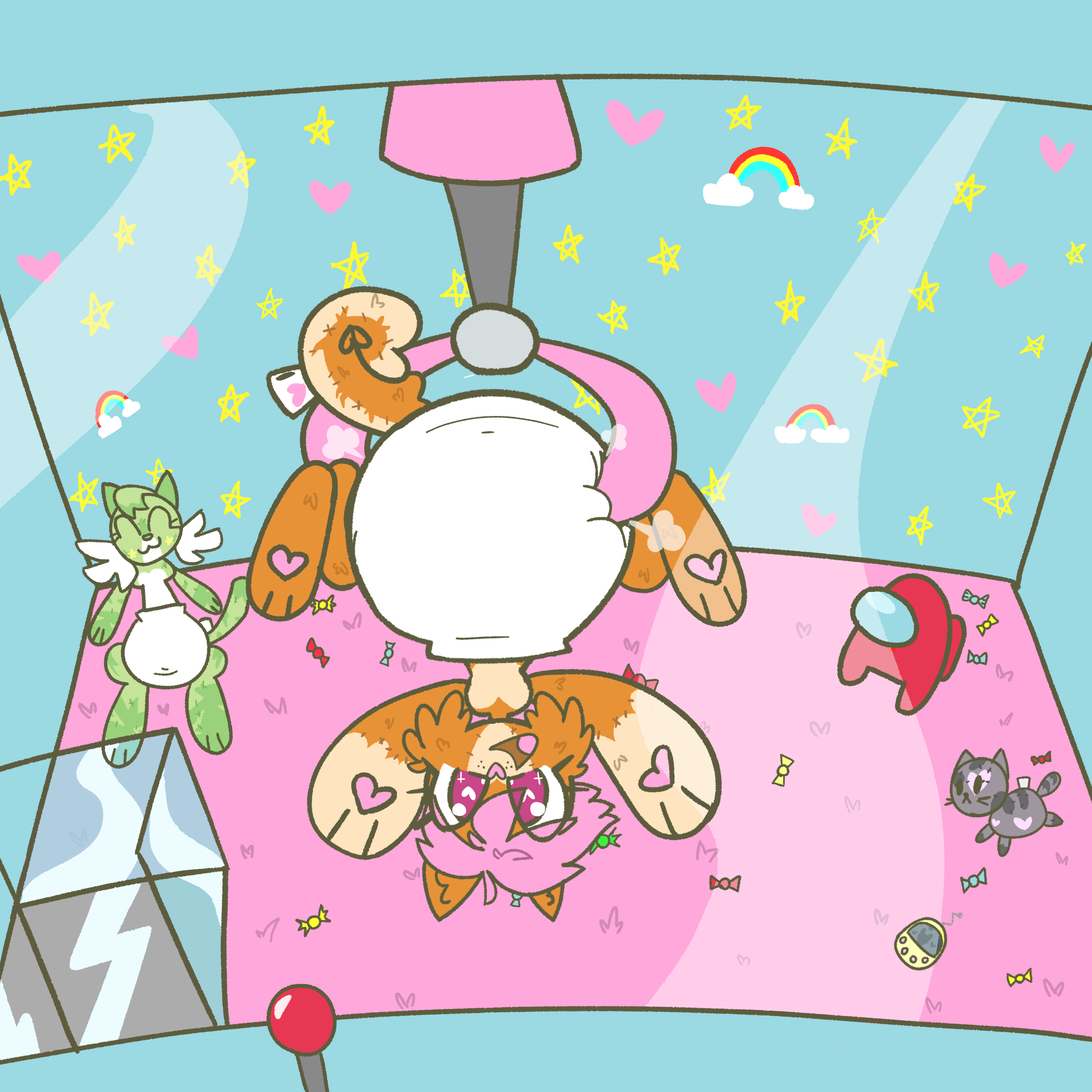 A picture of an orange plush puppy named Issy, in a large diaper, being picked up in a claw machine. The claw is grabbing her by the diaper as she hangs upside down, with her paws out wide and smiling. In the claw machine, there is also a plushie of Tiger in a diaper, as well as an Amongus Crewmate plushie.