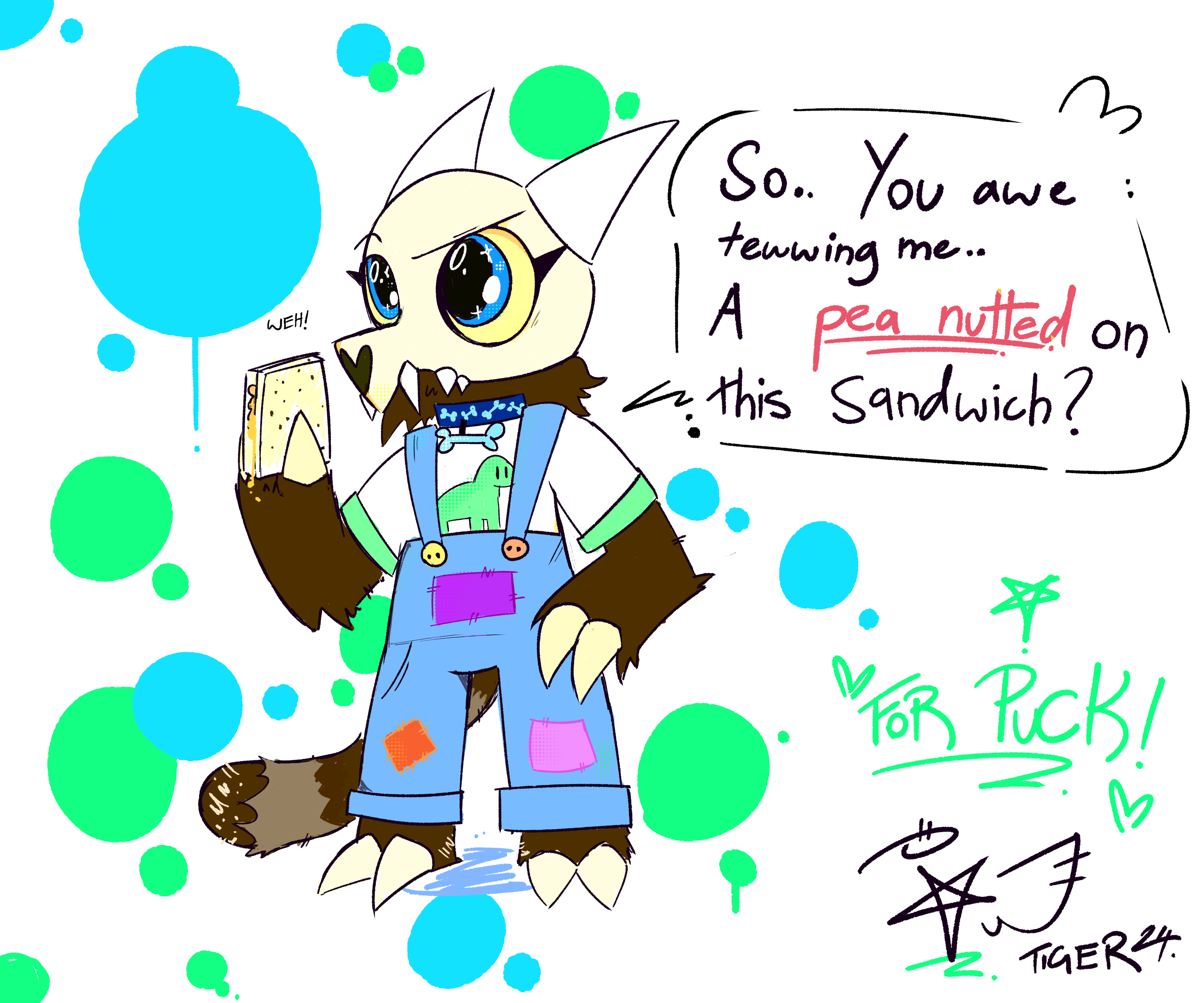 A picture of Puck, the Titan (as from The Owl House).He is a short bipedal creature with a long raccoon-ish tail, an outer skull and horns. He wears blue overalls with patches in them, and a cute kids white shirt with a green dinosaur on it, as well as a blue puppy-dog bone collar. He is holding a peanutbutter sandwich and looking slightly confused.