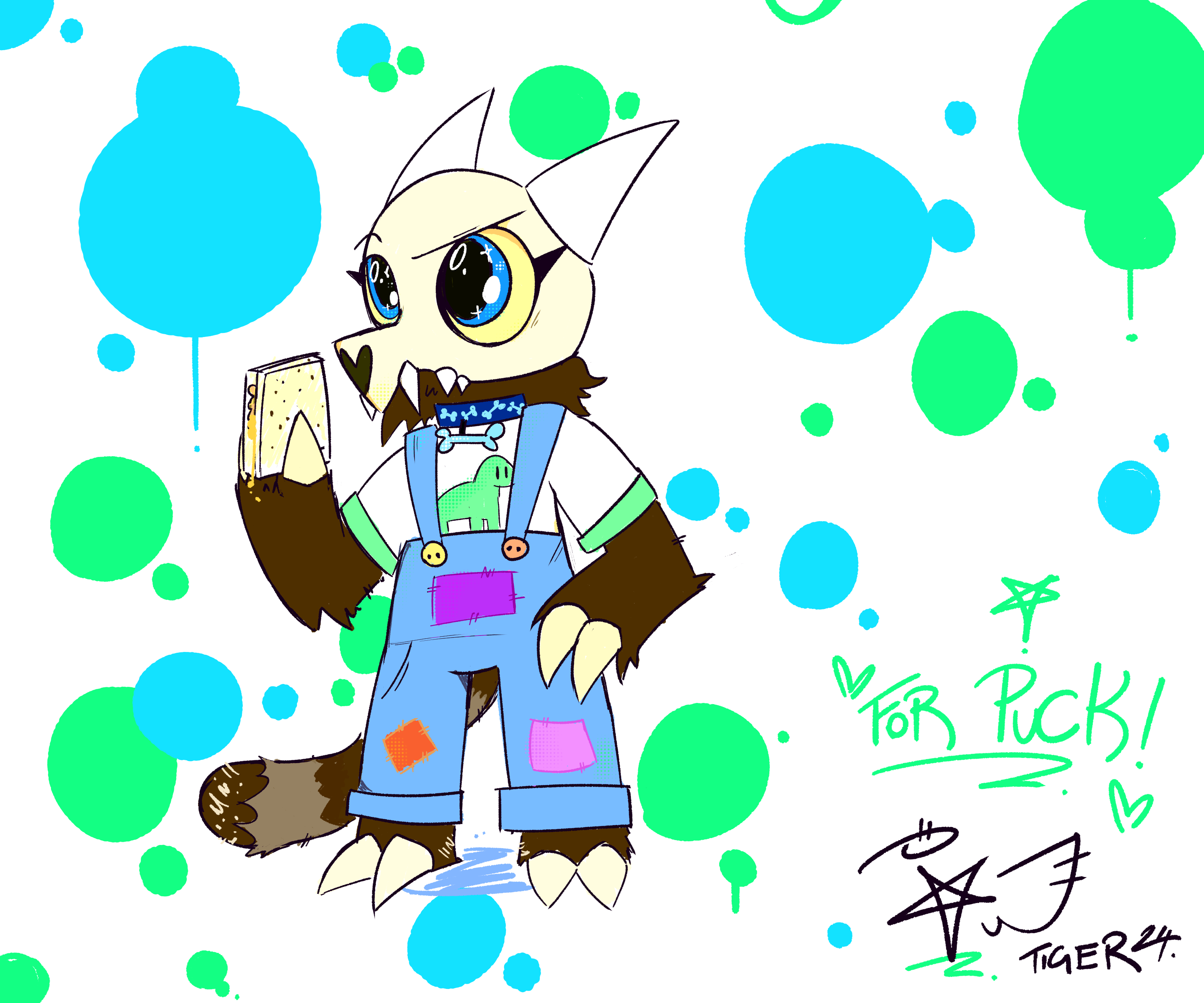 A picture of Puck, the Titan (as from The Owl House).He is a short bipedal creature with a long raccoon-ish tail, an outer skull and horns. He wears blue overalls with patches in them, and a cute kids white shirt with a green dinosaur on it, as well as a blue puppy-dog bone collar. He is holding a peanutbutter sandwich and looking slightly confused.