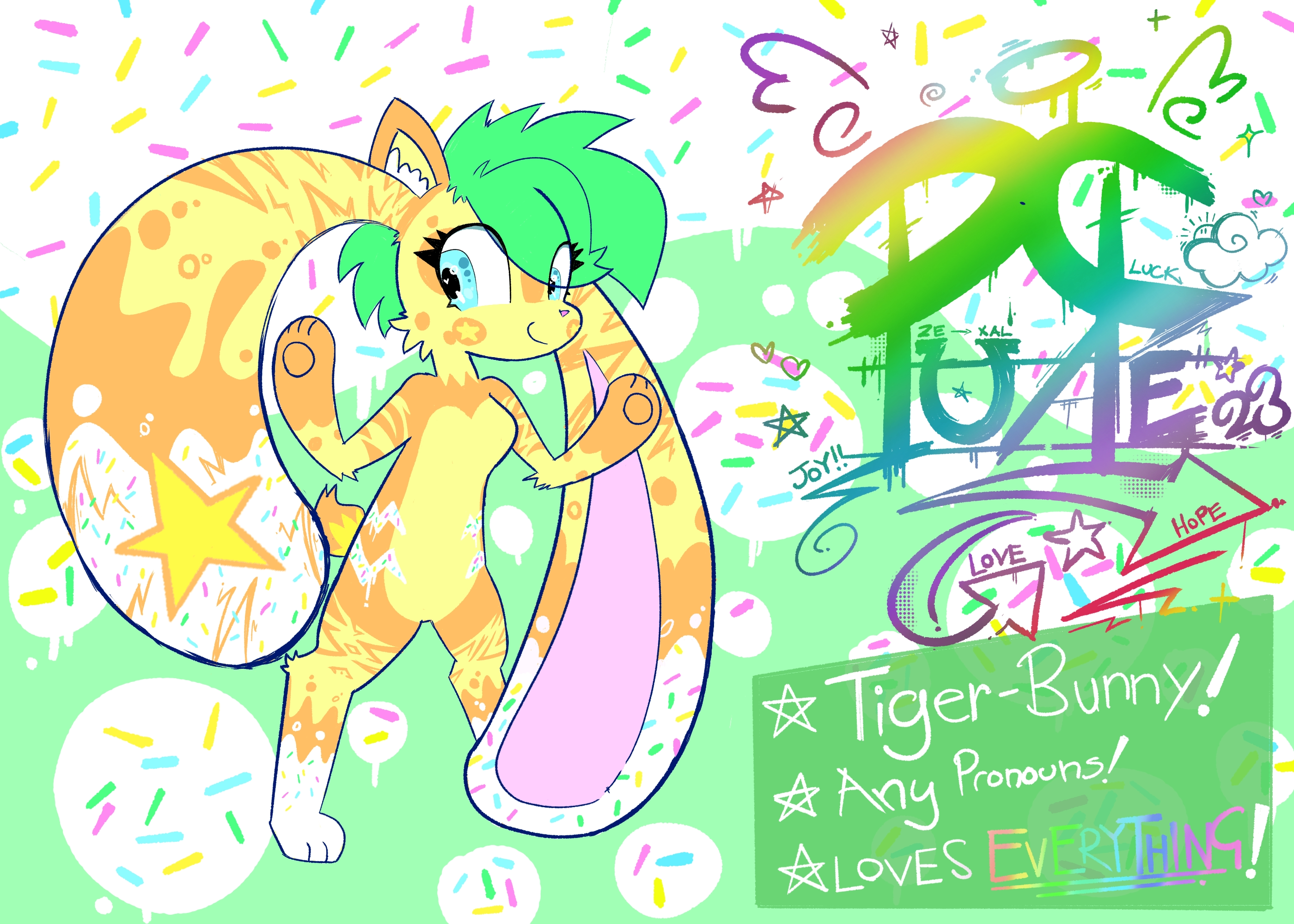 Beside her, a large heavily stylized rainbow graffiti-style tag says "PURE". Below that, a box says: "Tiger-Bunny! Any Pronouns! Loves EVERYTHING!". The EVERYTHING is written in rainbow.
