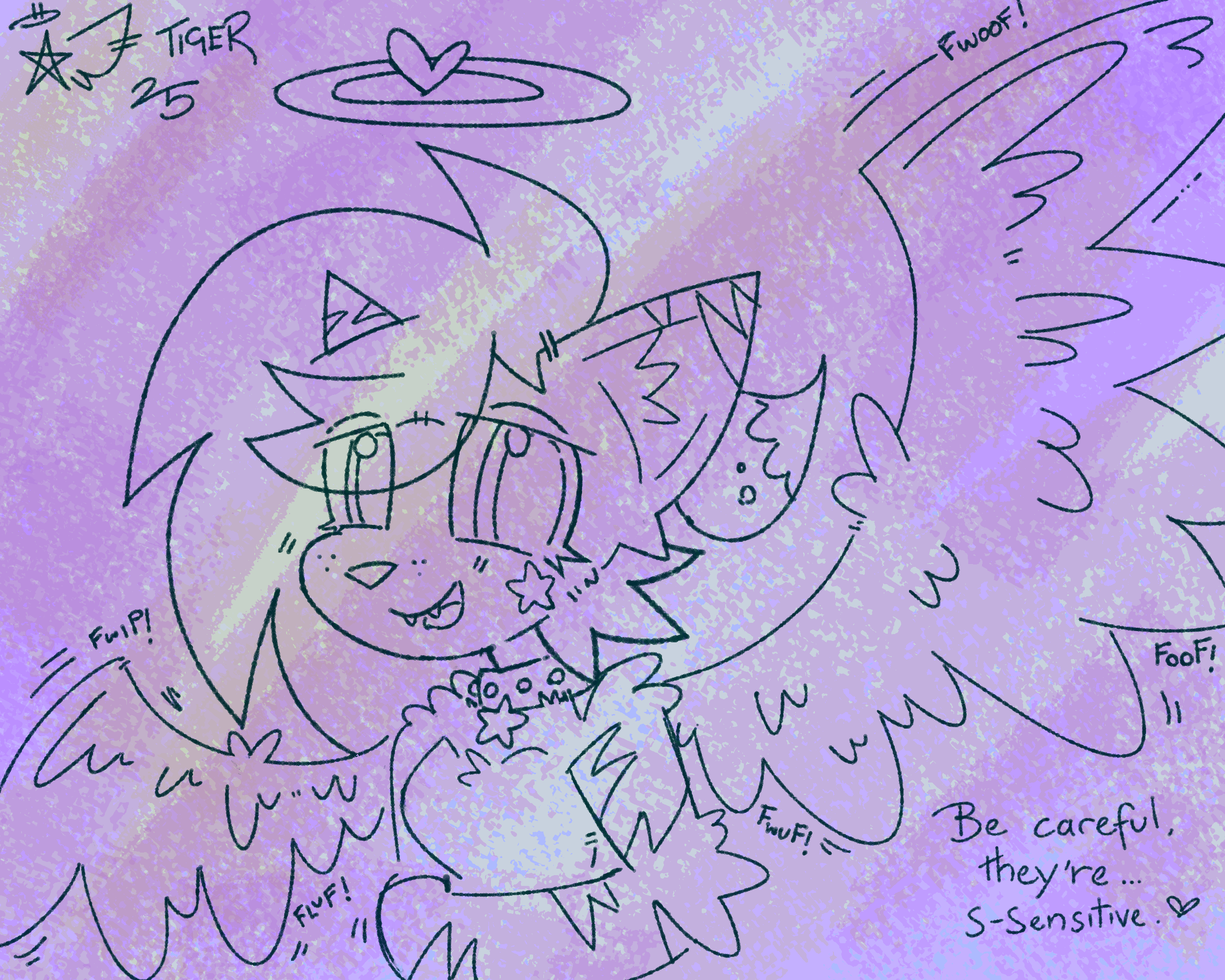 A sketch of Tiger, with her angel wings spread out. She has a flustered, smiling awkward expression and is hugging her own arm. She spreads out her wings, exposing all of the feathers (with "fwuf!" and "fwip" sounds.) Her halo is above her head, the emote star turned into a a heart.
