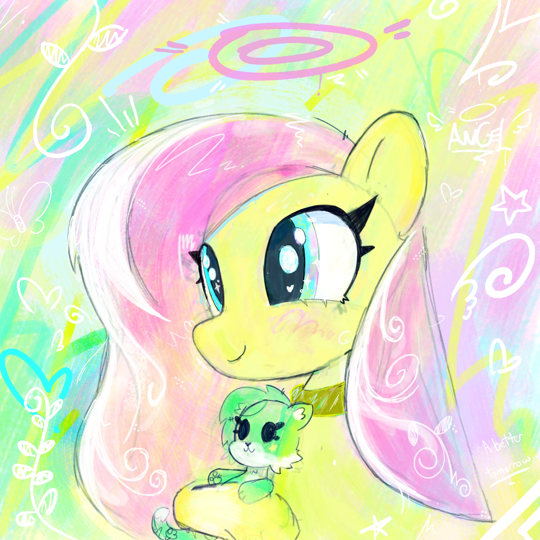 A profile picture of Silky Shine as a pegasus, drawn in a loose, painterly style. She has a simple smiling blushing face, with a golden collar on her neck, and is holding a small Tiger plushie against her chest in her hoof. Her body and mane blend with the background, which is vibrant and colorful with white drawings overlaid onto the colors - little butterflies, vines and hearts, and the text "Angel","A better tomorrow". There's a pink painted halo above her head.