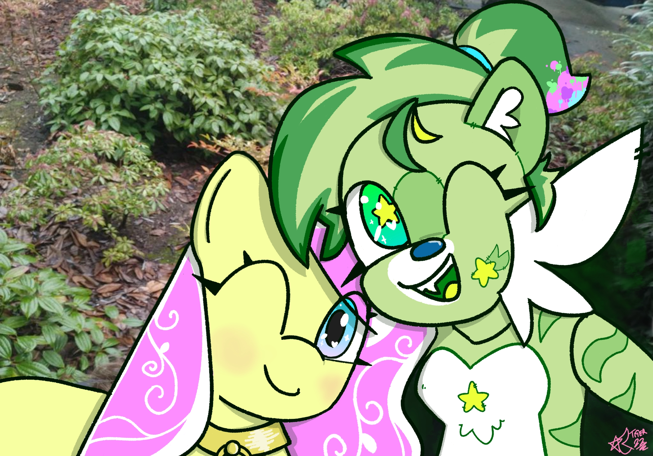 A picture of Tiger and Silky Shine posing like in a selfie, drawn on top of a real life image with greenery behind them. Both have one eye closed and one eye open and are smiling.