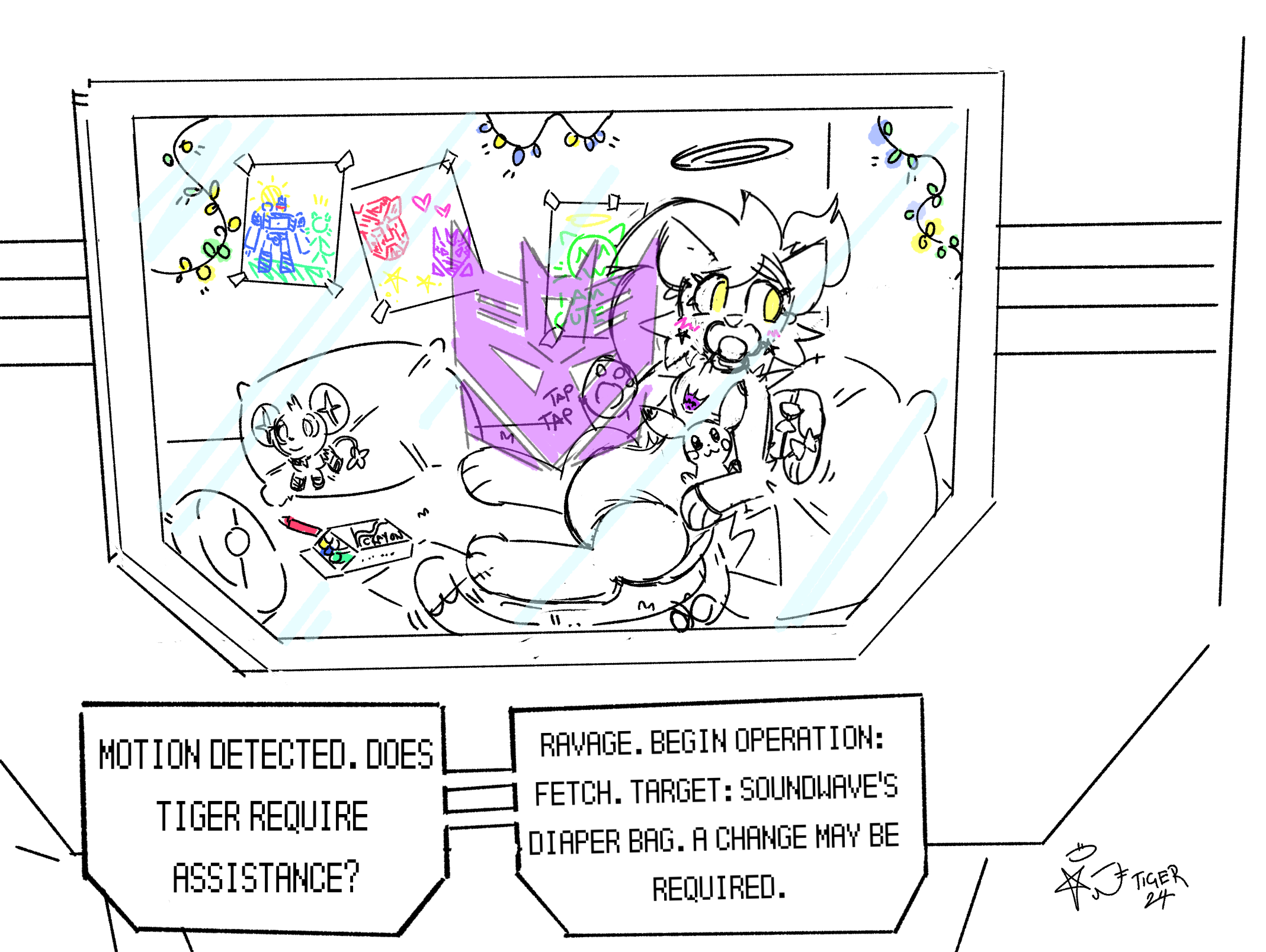 A picture of Tiger, wearing a onesie with the Decepticon Logo on her chest as well as a diaper, inside of the Transformer Soundwave's cassette deck. The cassette deck has been converted into a comfortable little room for Tiger, with cushions, pokemon plushies, fairy lights, crayons and paper. There are a few crayon drawings attached to the walls of her space - one of her with soundwave, one of the Autobot and Decepticons getting along, and one more of a simple green tiger face with a halo that says "I AM CUTE". Tiger is tapping on the glass behind the Decepticon Logo on Soundwave's chest with a blush, her wings bound by bows.